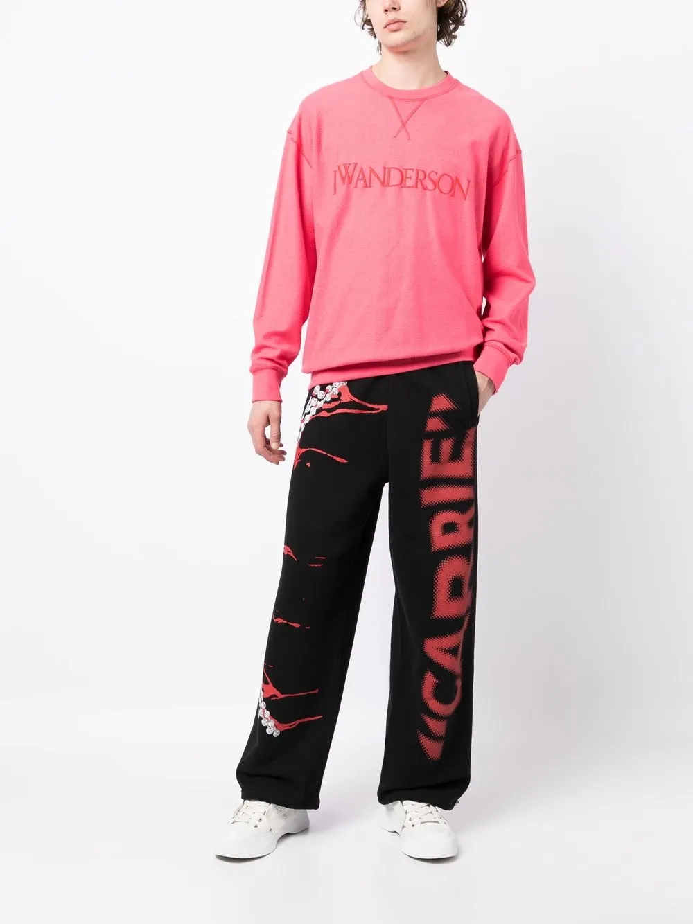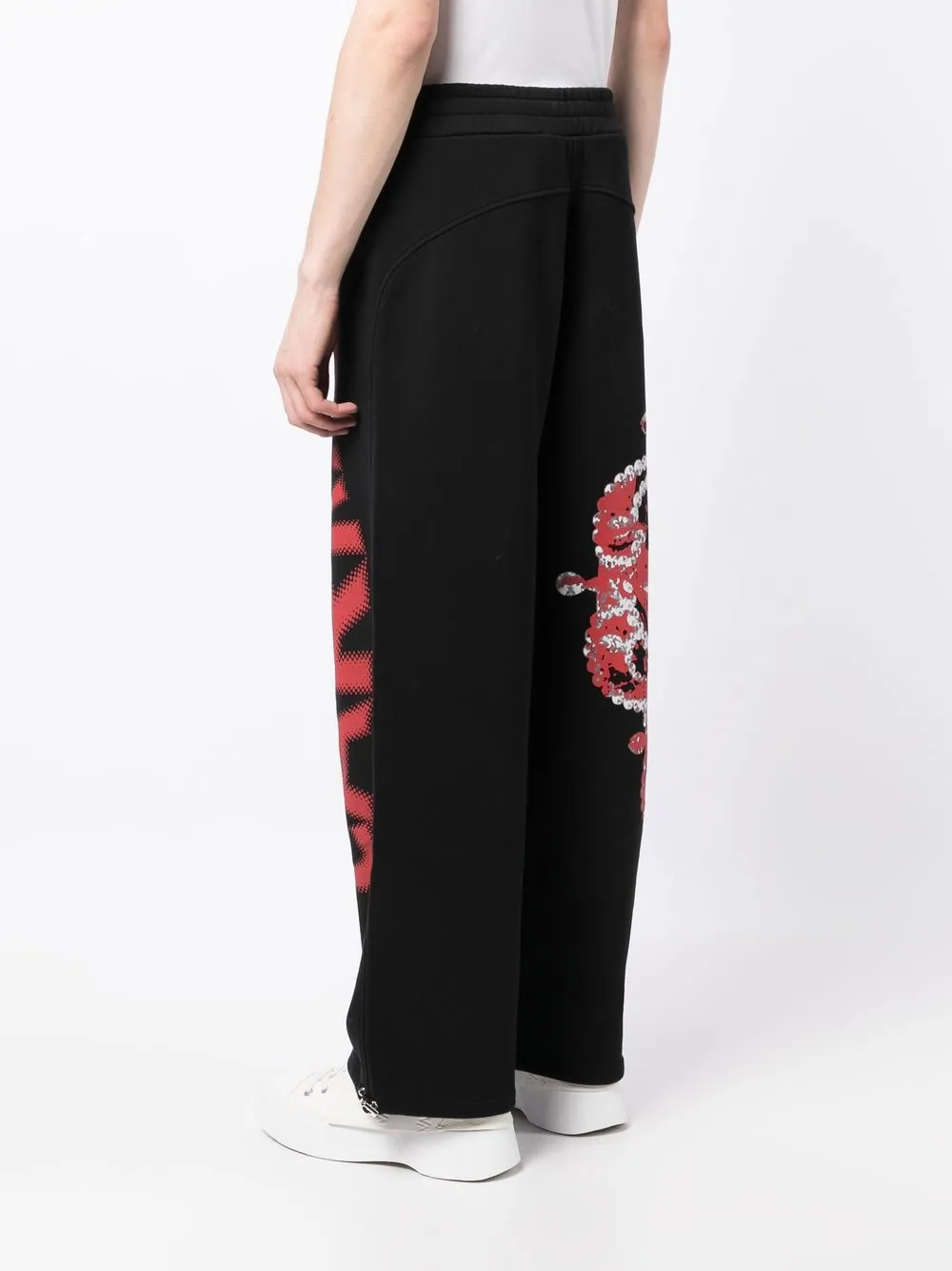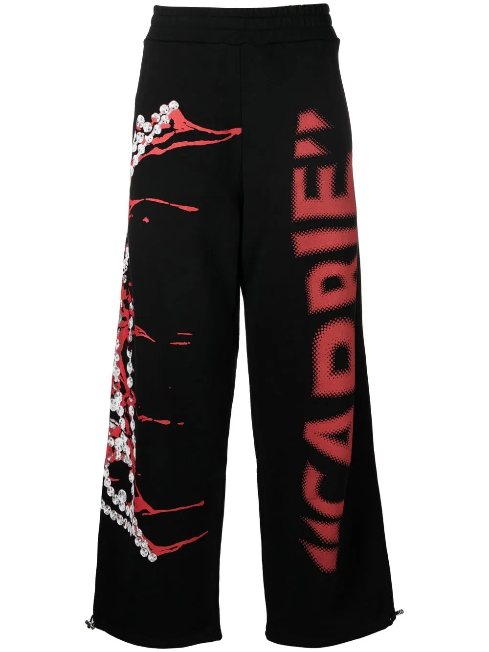 Schwarz, Rot, Baumwolle, grafischer Print, elastischer Bund, seitliche Eingrifftasche, gerades Bein.