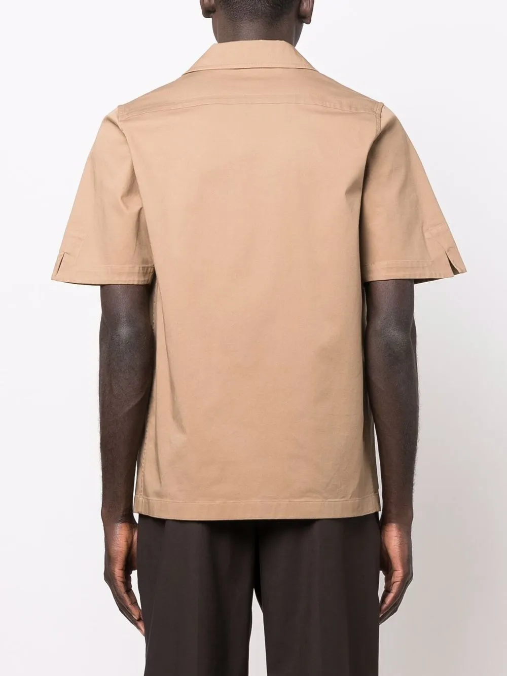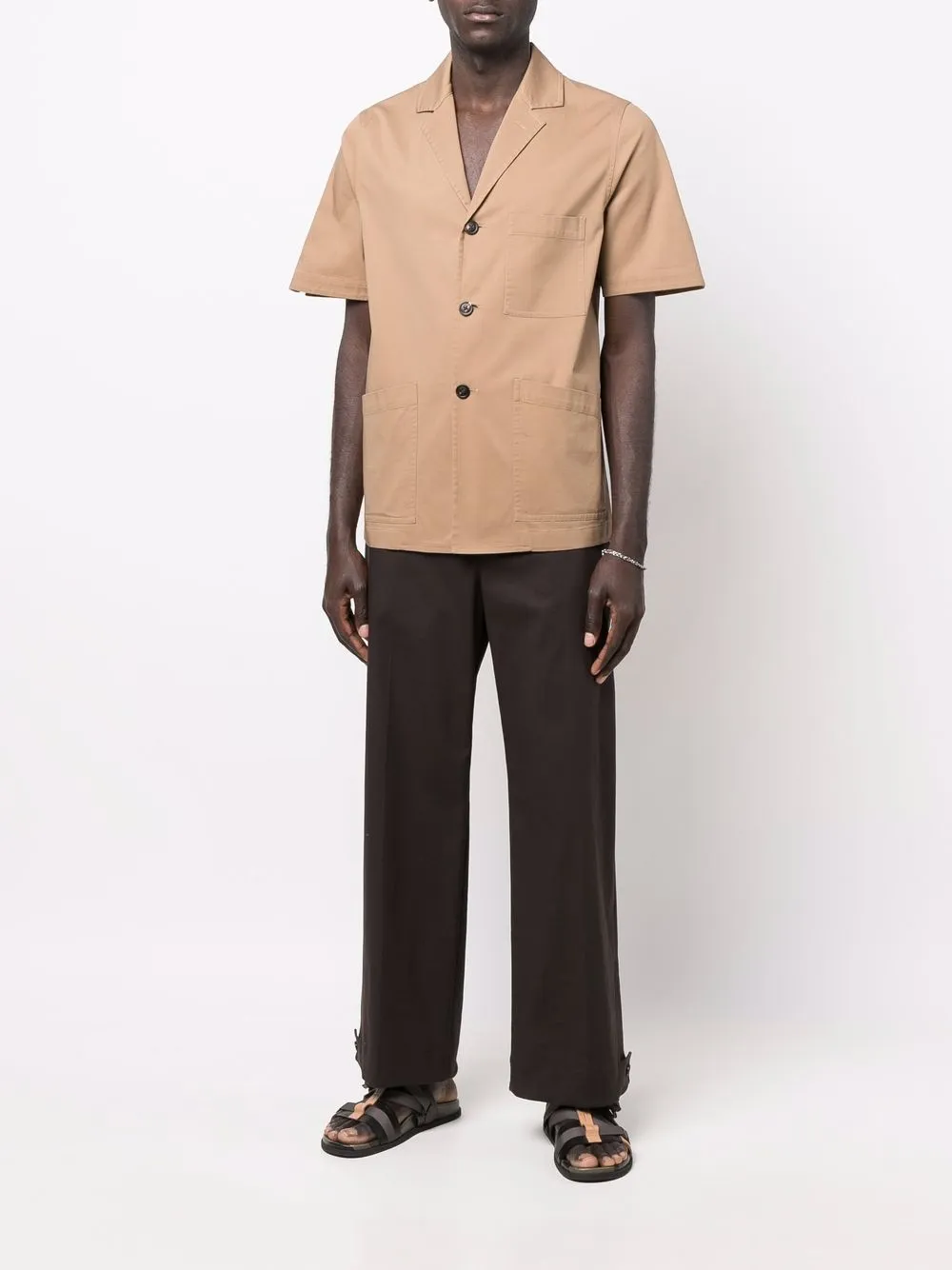 Fallendes Revers, Knopfverschluss vorne, kurze Ärmel, aufgesetzte Brusttasche, zwei aufgesetzte Taschen vorne, gerader Saum.