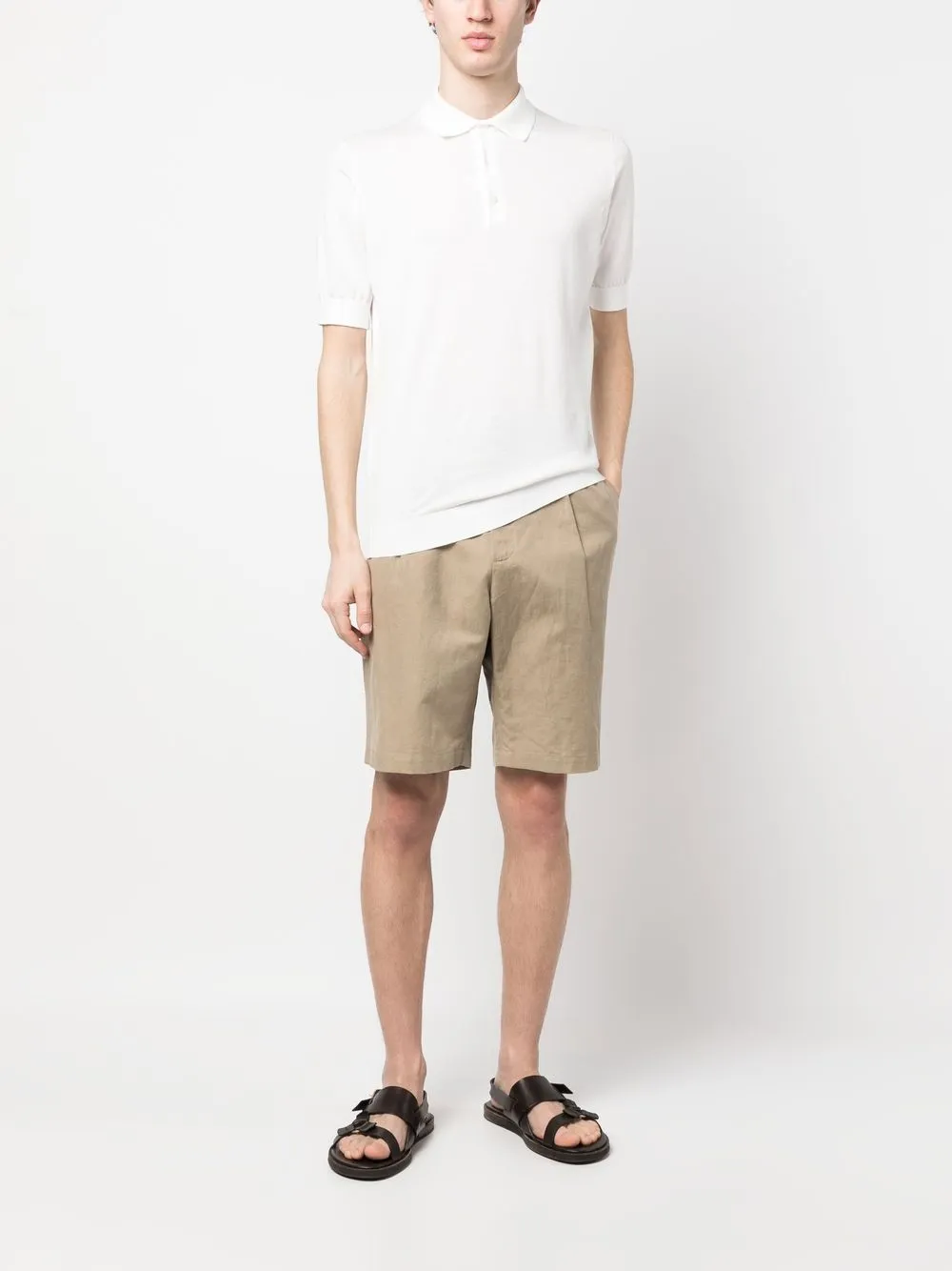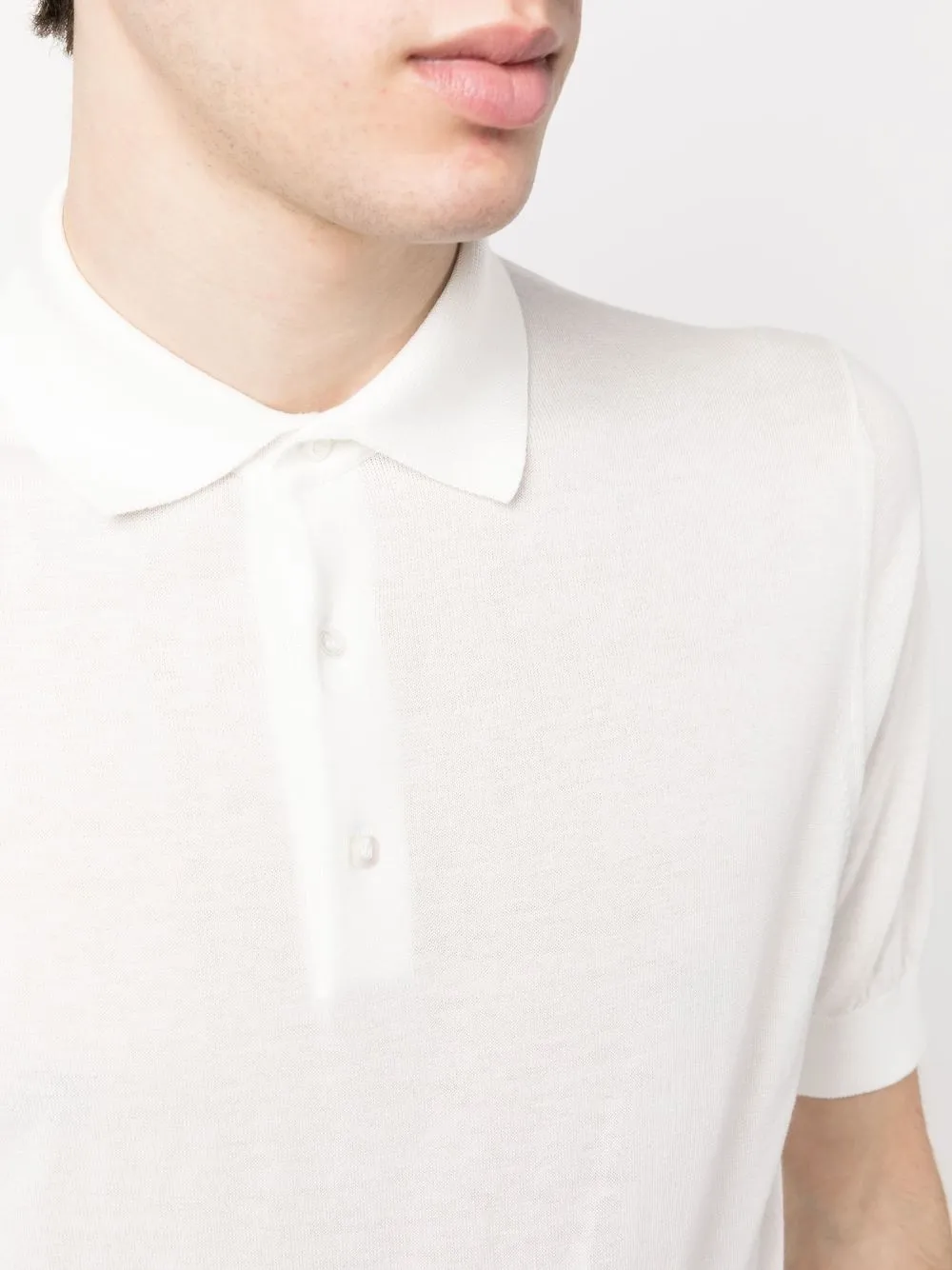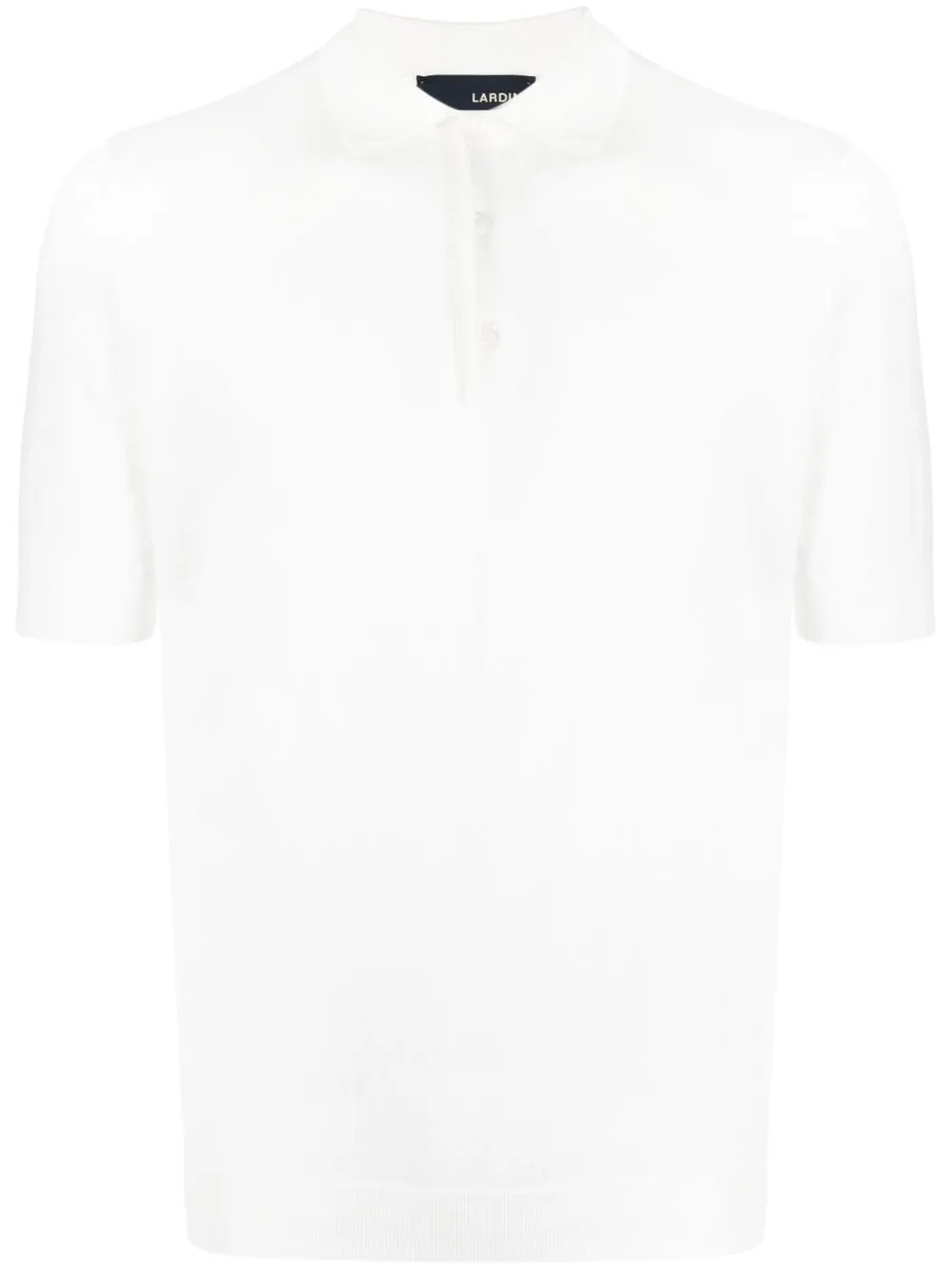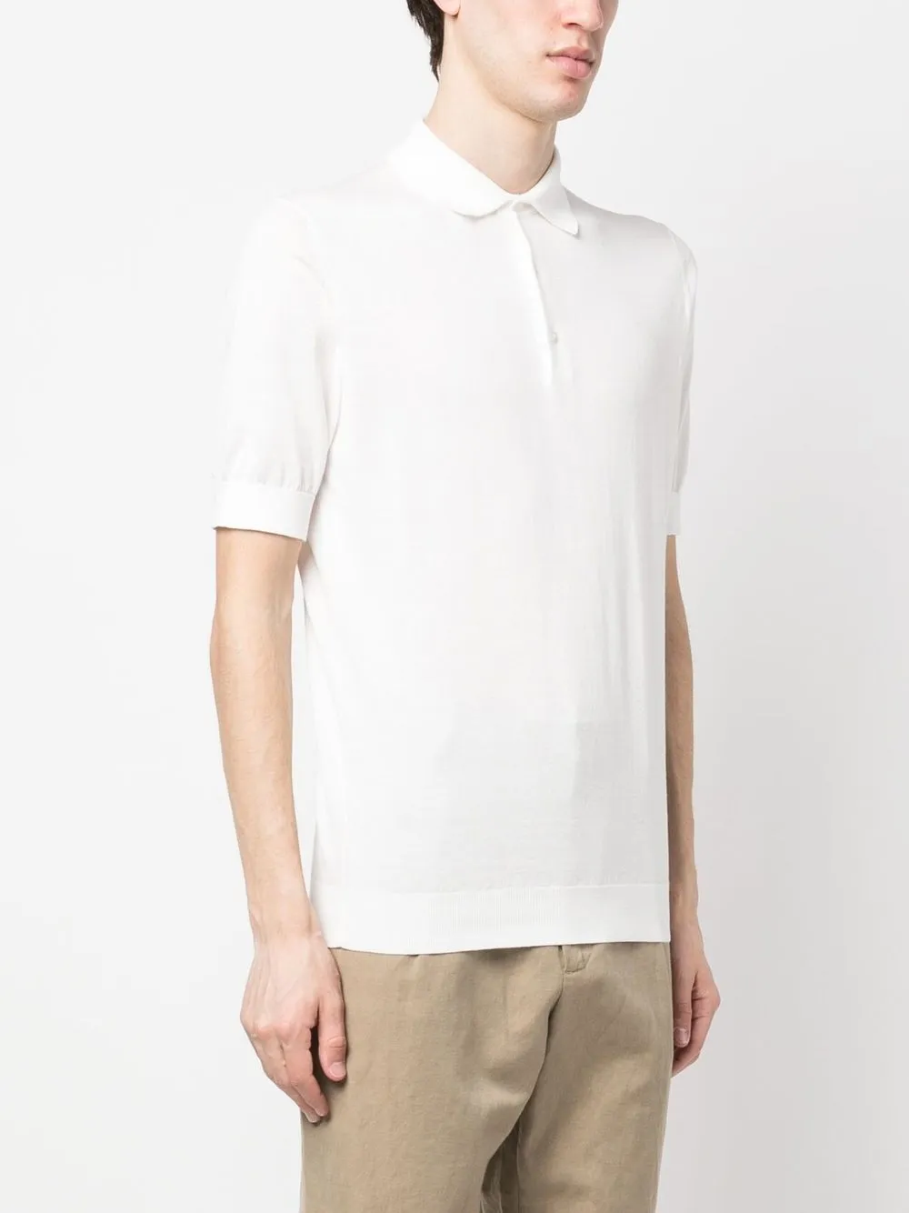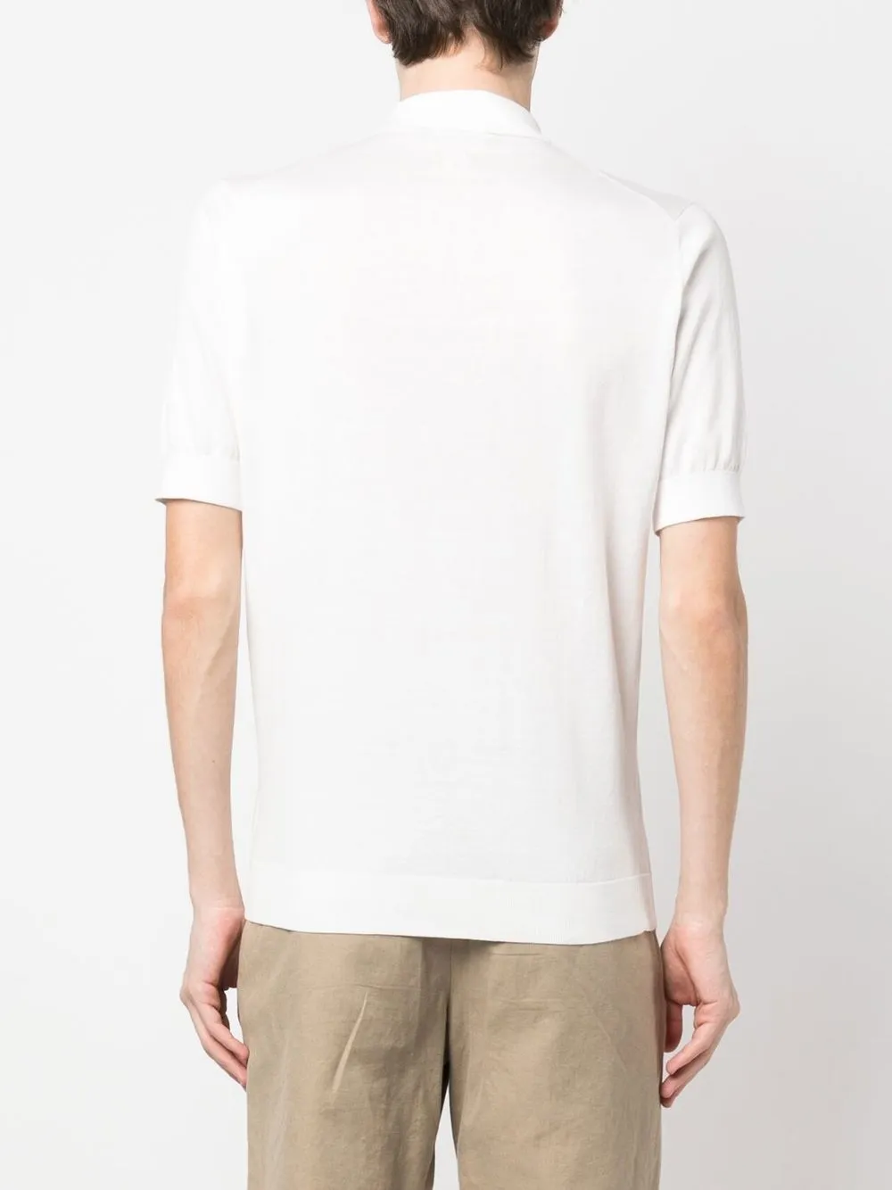 Weiß, Baumwolle, Poloshirtkragen, kurze Ärmel, gerader Saum, gerippter Saum.