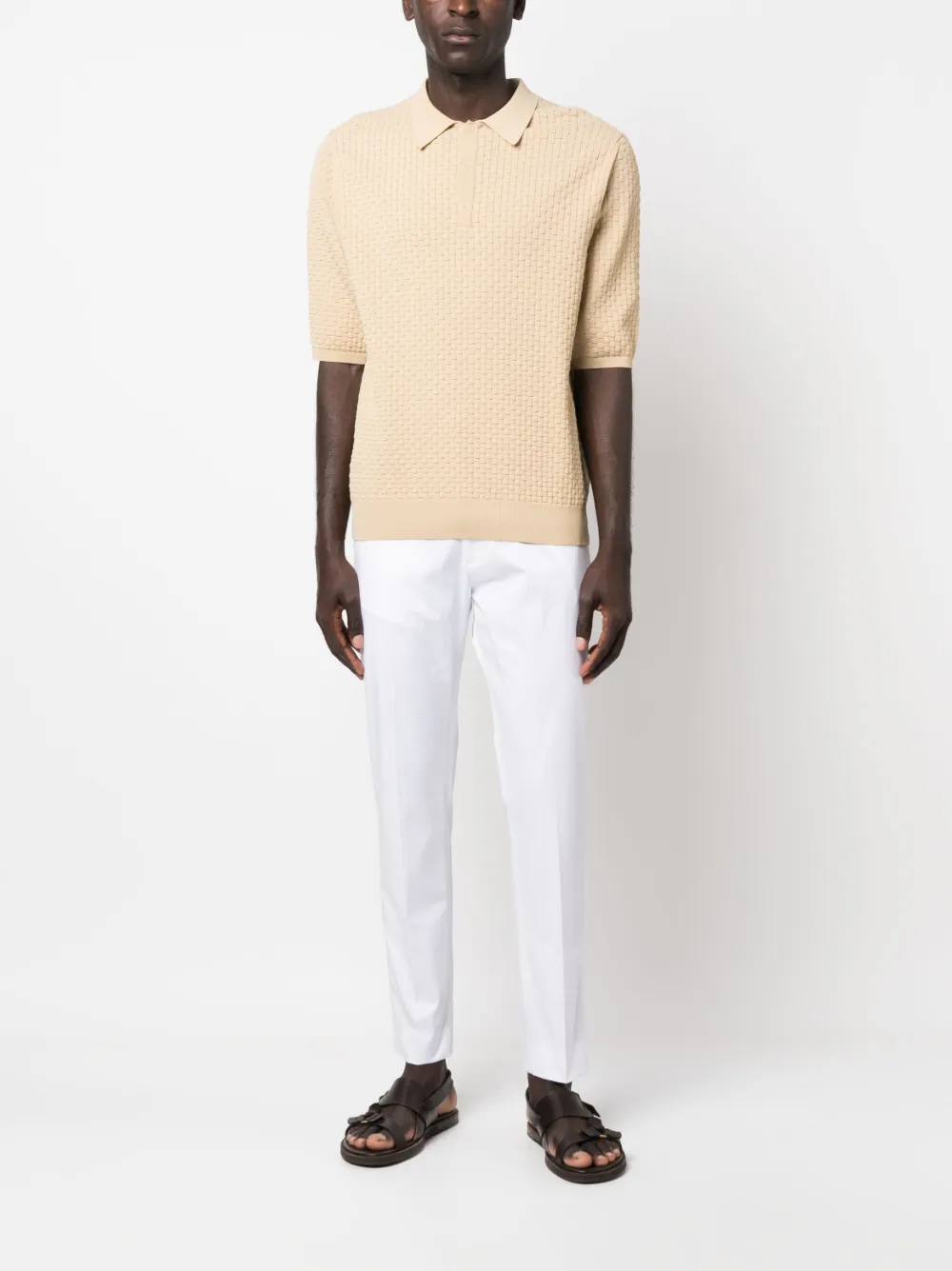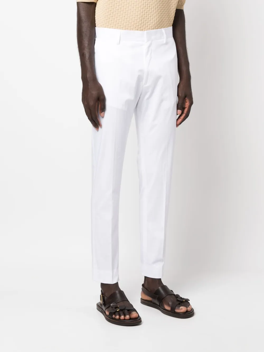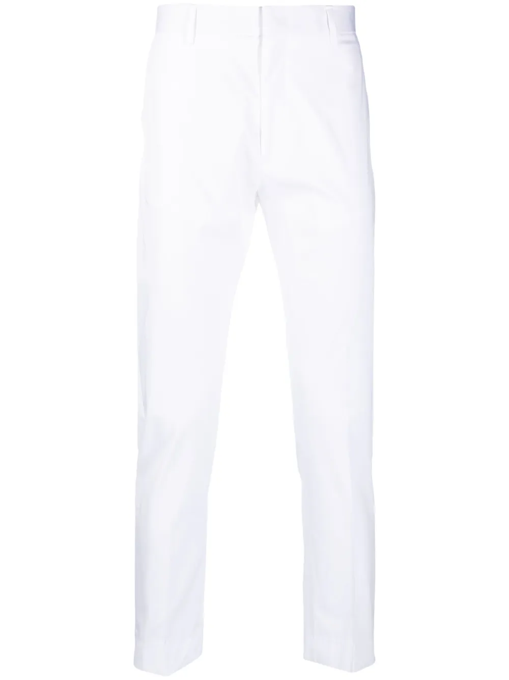 Weiß, verdeckter Verschluss vorne, Gürtelschlaufen, zwei Eingriffstaschen hinten, gerader Saum.