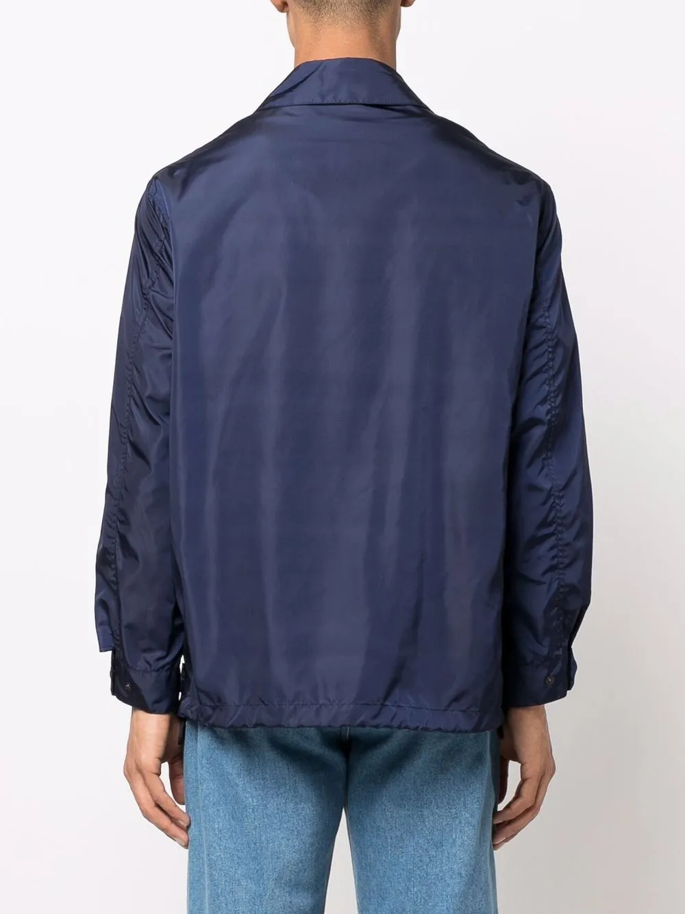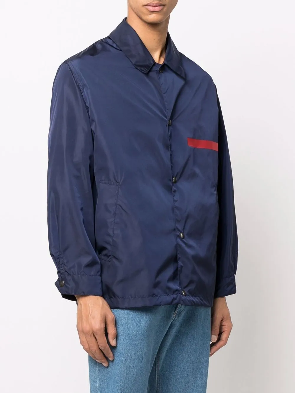Spreizkragen, Druckknopfverschluss vorne, zwei Eingrifftaschen vorne, aufgedruckte Querstreifen, lange Ärmel, Manschetten mit Druckknöpfen.