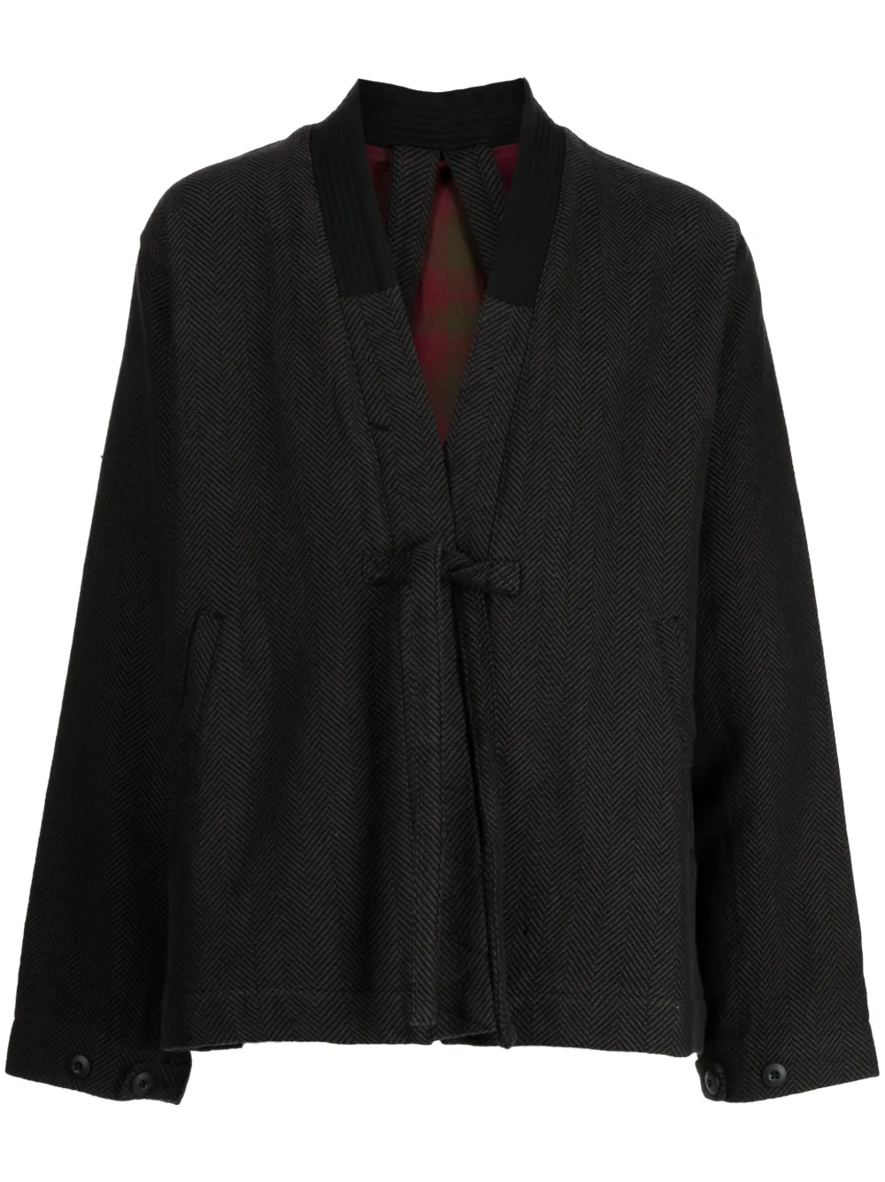 Schwarz, Grau, Baumwolle, Fischgrätenmuster, V-Ausschnitt, Schleifenverschluss vorne, lange Ärmel, Knopfmanschetten, zwei Eingrifftaschen vorne, Reißverschlusstasche innen, gerader Saum, komplett gefüttert.