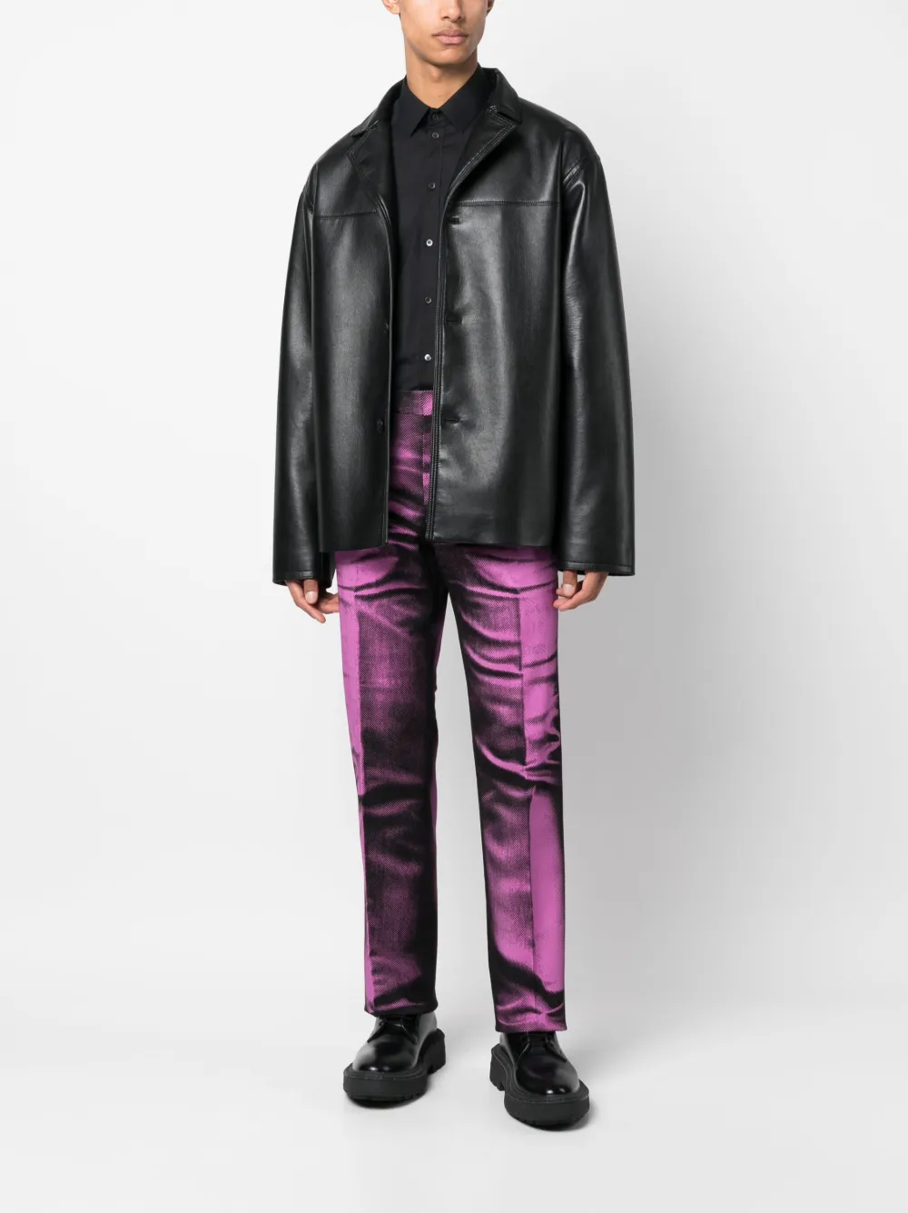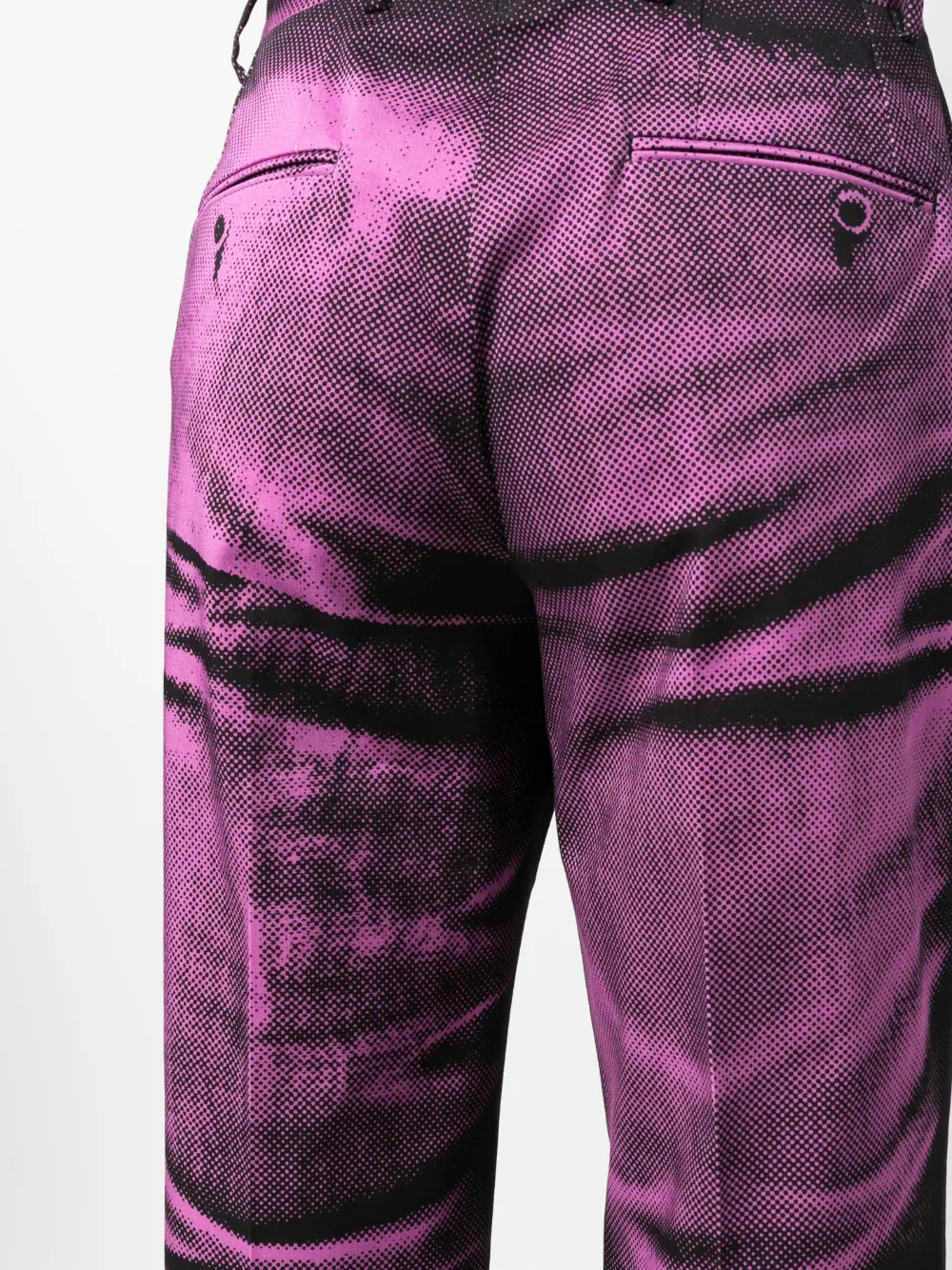Electric Purple, Stretch-Design, grafischer Print, Gürtelschlaufen, verdeckter Verschluss vorne, zwei seitliche Eingrifftaschen, Gesäßtasche mit Knopfverschluss hinten.