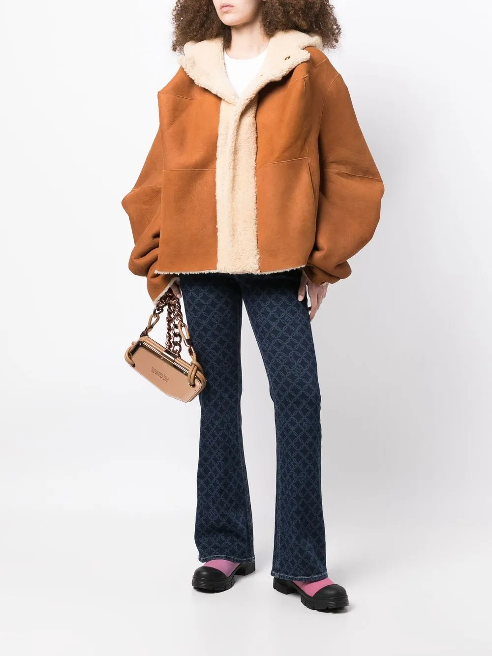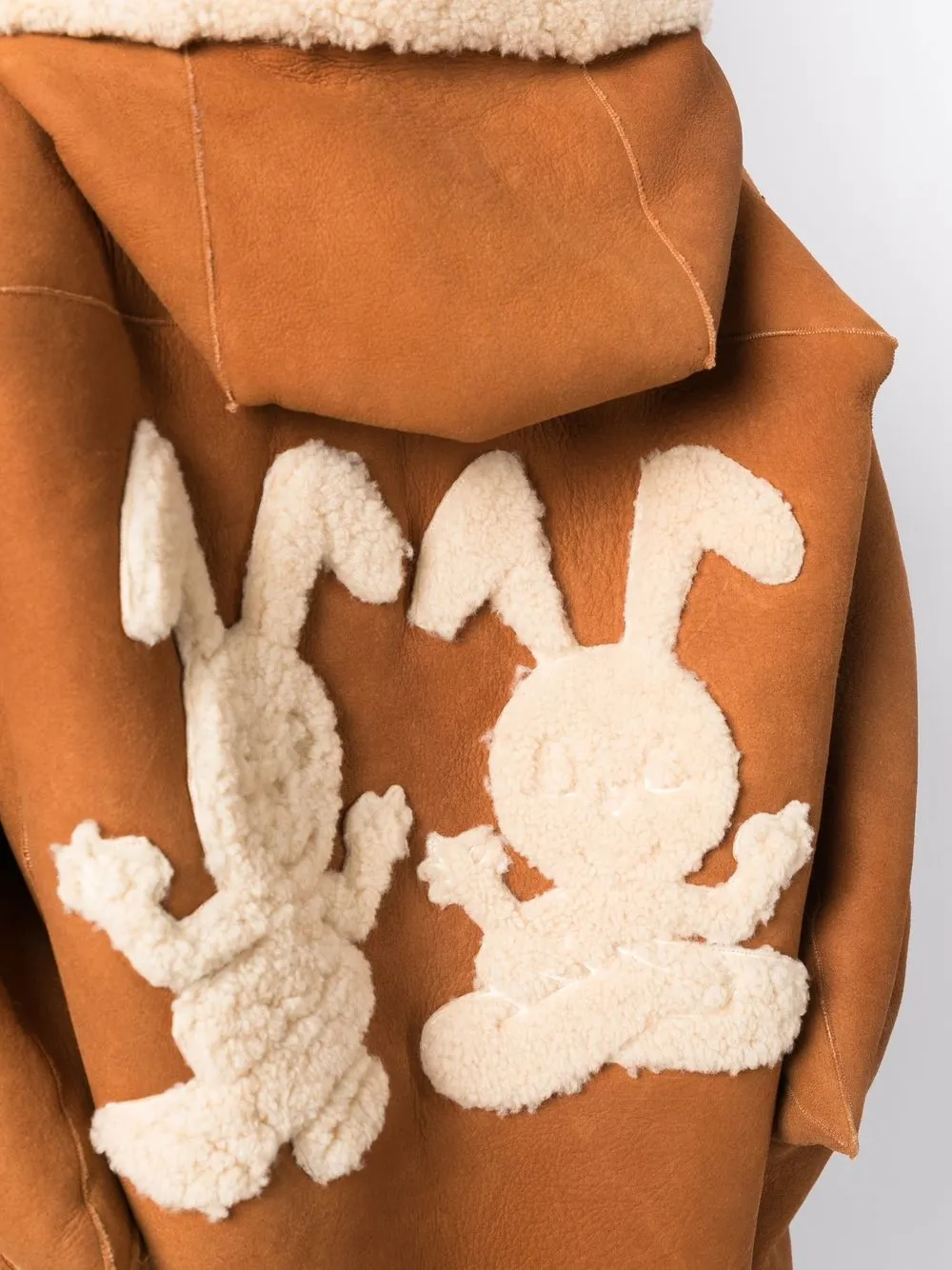 Braun, Cremeweiß, Schafleder, Shearling-Futter, klassische Kapuze, verdeckter Verschluss vorne, tiefe Schulter, lange Ärmel, zwei seitliche Eingrifftaschen, gerader Saum.