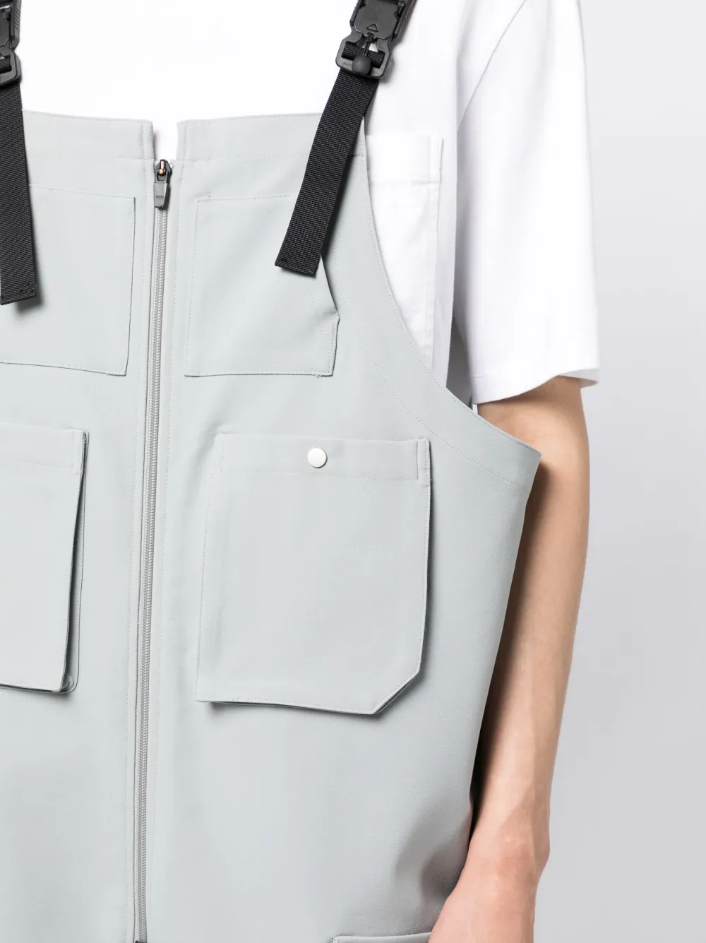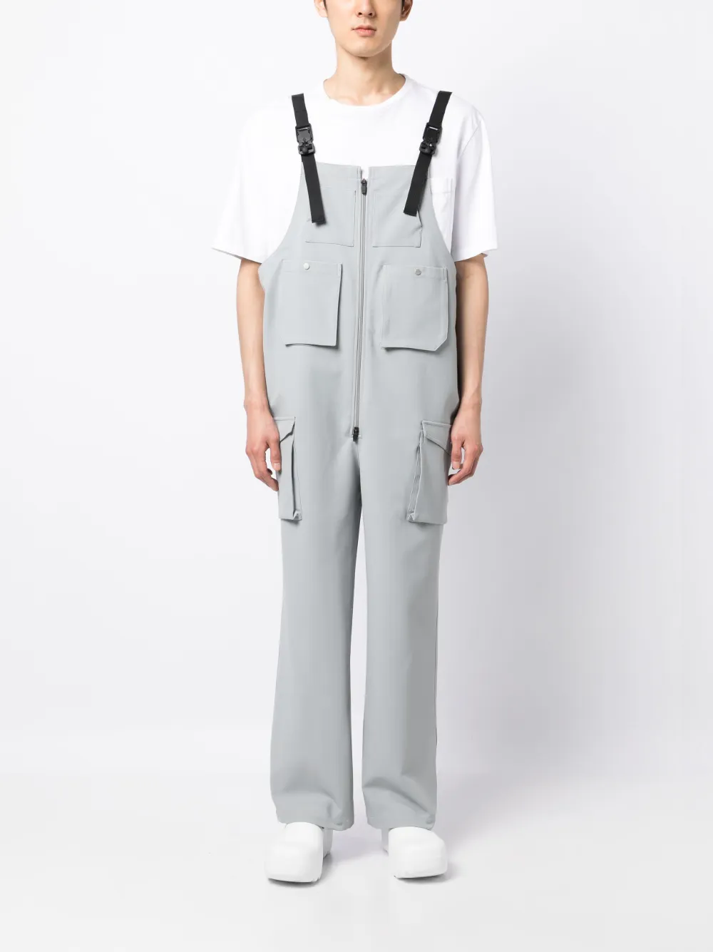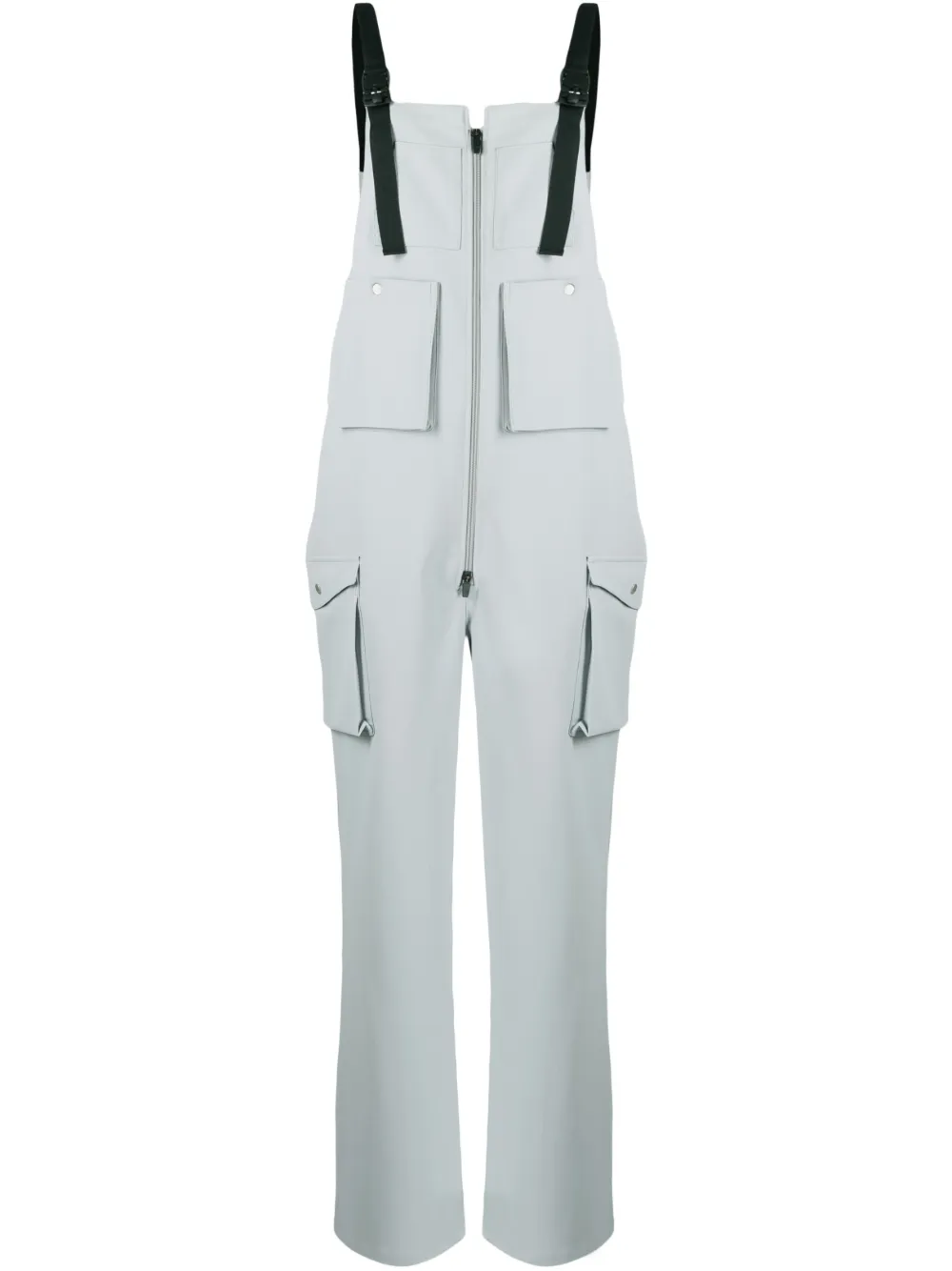Hellgrau, Logo-Prägung hinten, Reißverschluss vorne, verstellbare Träger, zwei aufgesetzte Taschen vorne, zwei aufgesetzte Gesäßtaschen, zwei Klappentaschen an der Seite, gerades Bein, gerader Saum.