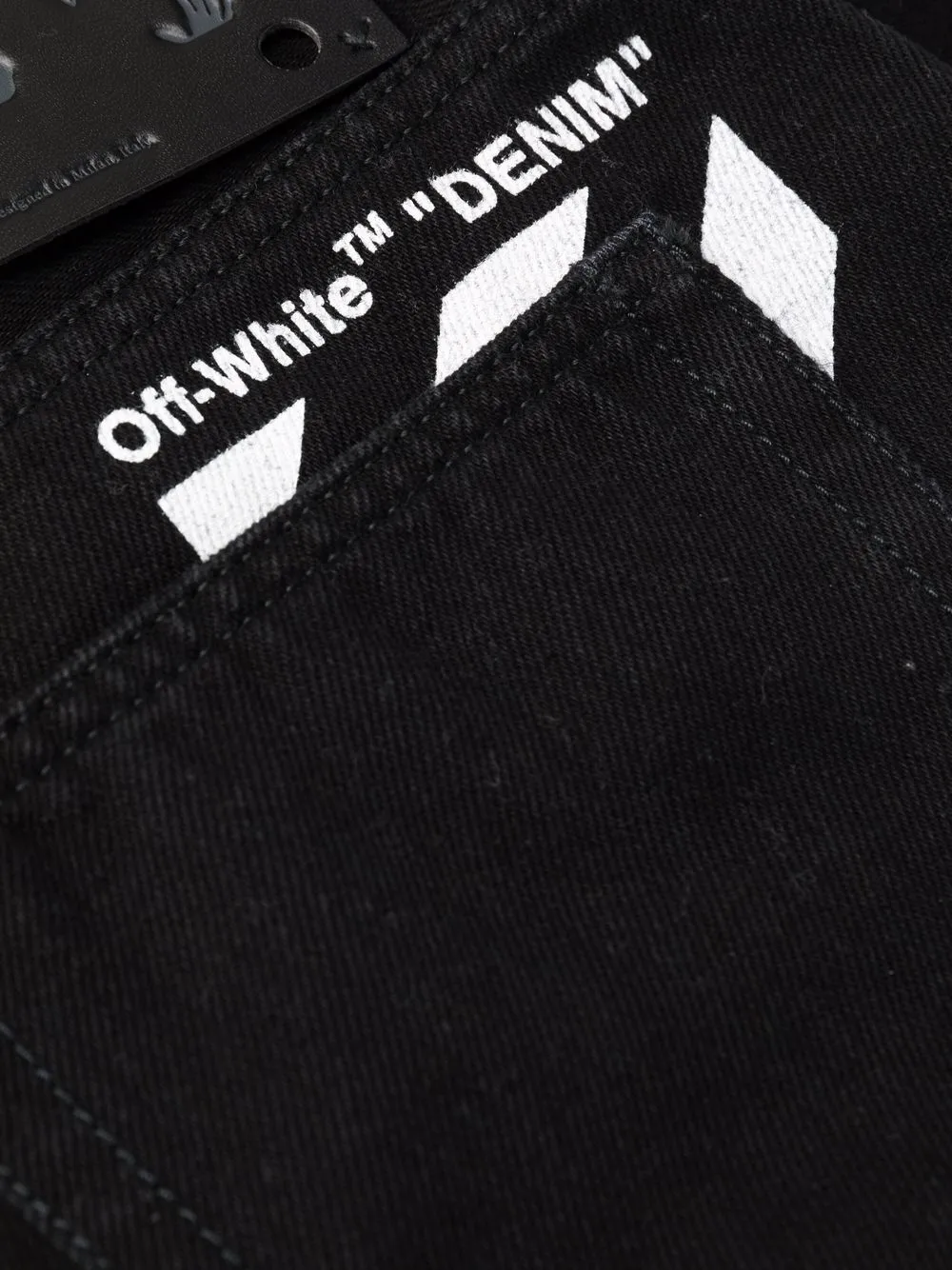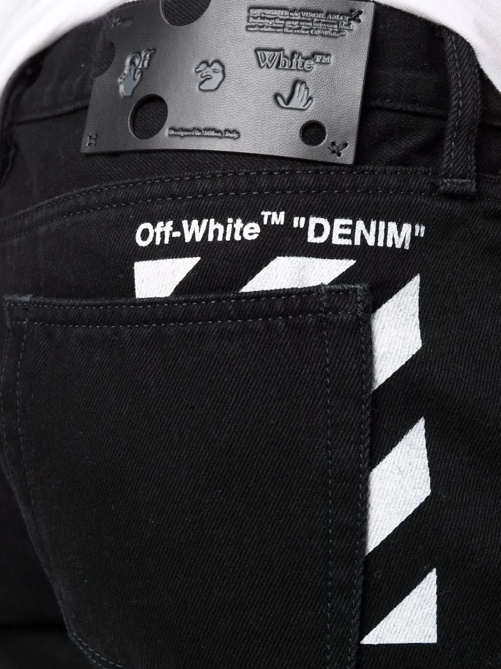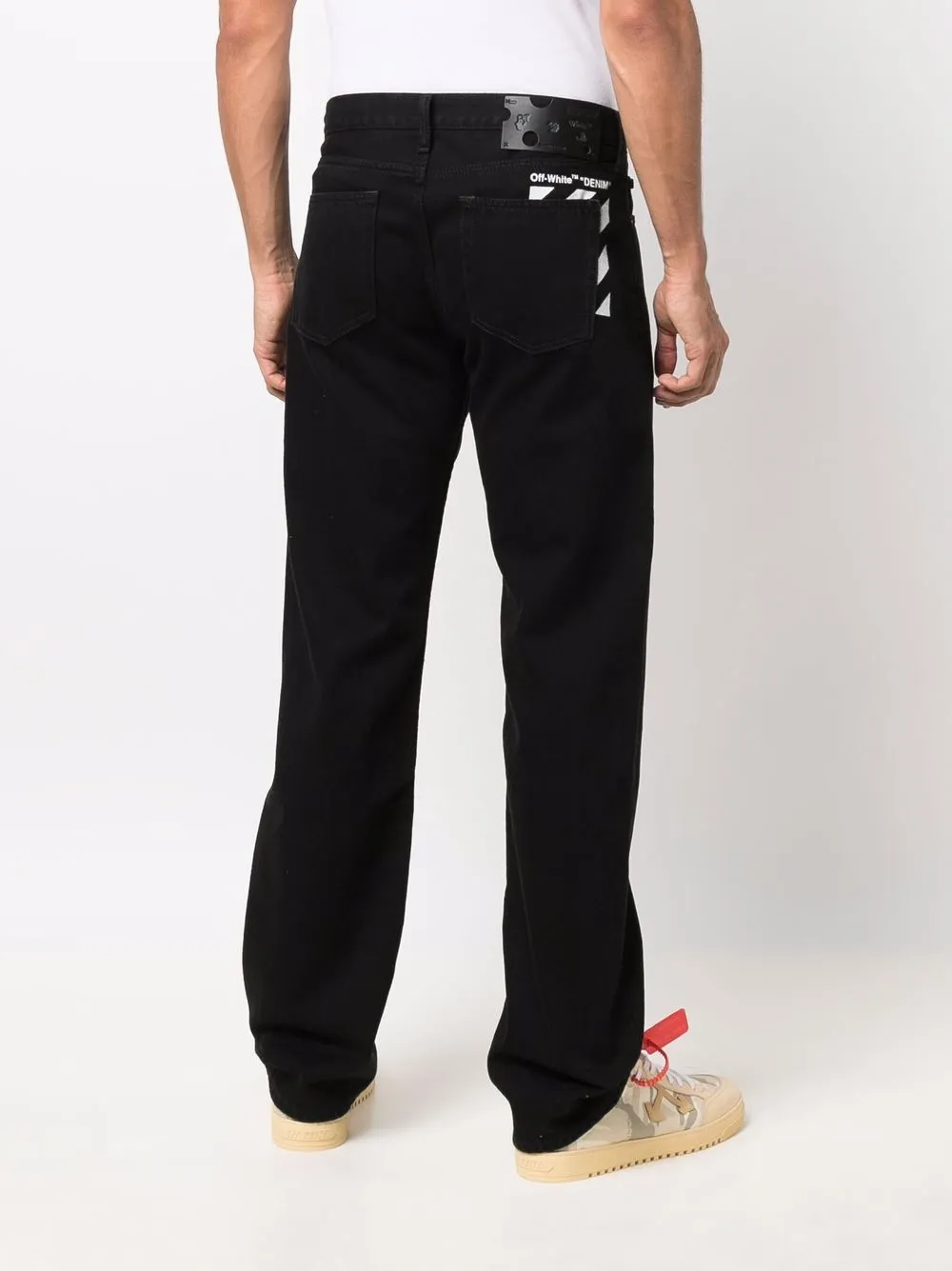 Logo-Patch hinten, diagonal aufgedruckte Streifen, mittlere Taille, Gürtelschlaufen, Knopf- und Reißverschluss vorne, Five-Pocket-Design, gerades Bein. Farbe: Schwarz. Material: Baumwolle.