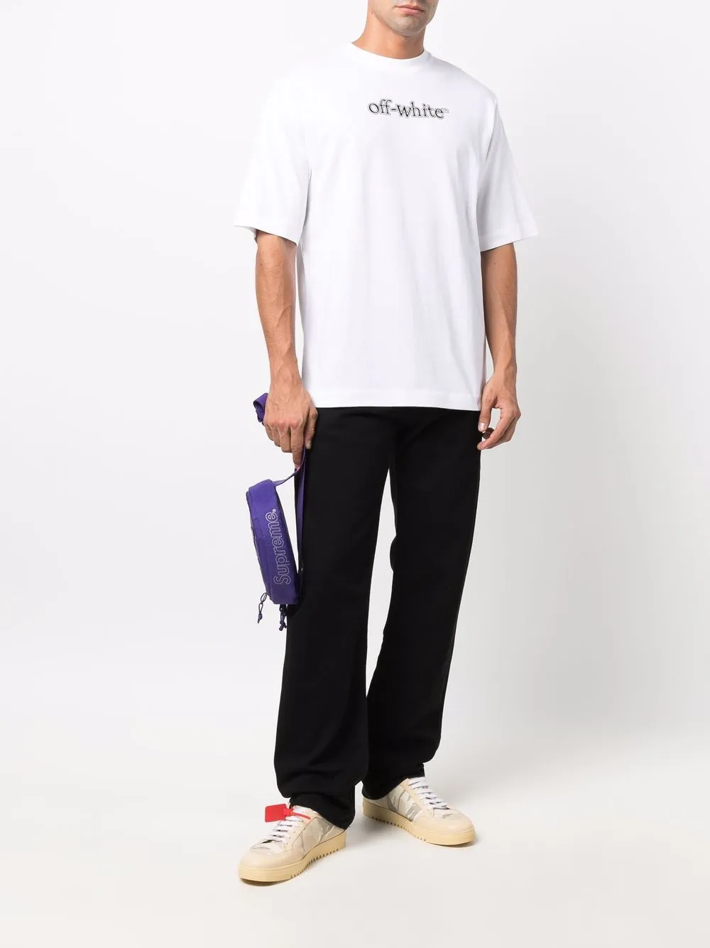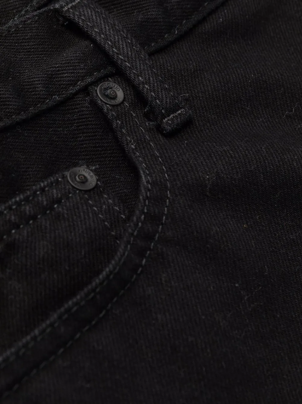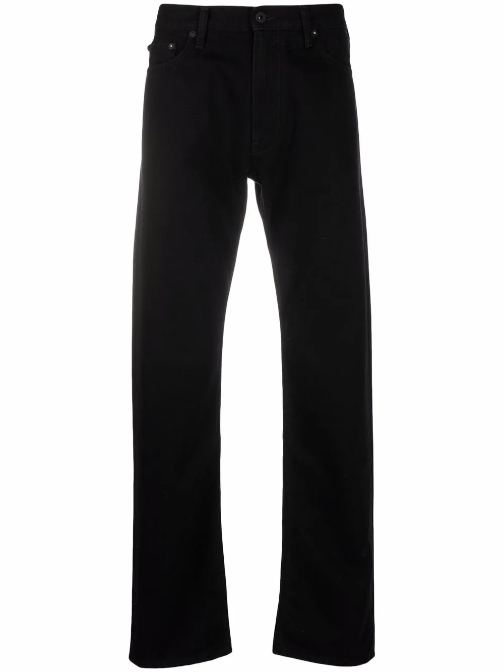 Logo-Patch hinten, diagonal aufgedruckte Streifen, mittlere Taille, Gürtelschlaufen, Knopf- und Reißverschluss vorne, Five-Pocket-Design, gerades Bein. Farbe: Schwarz. Material: Baumwolle.
