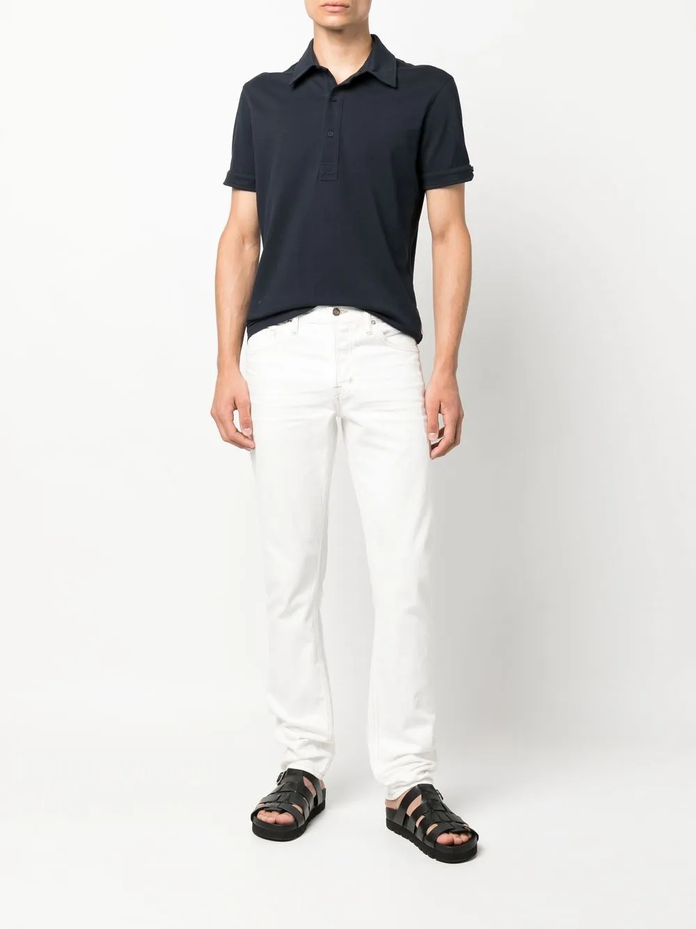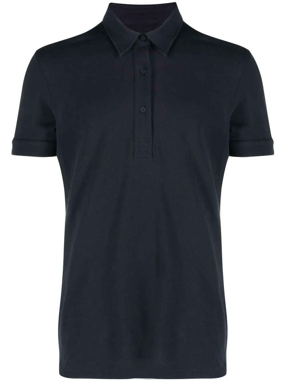 Dunkelblau, Baumwolle, Poloshirtkragen, Knopfleiste vorne, kurze Ärmel, gerader Saum.