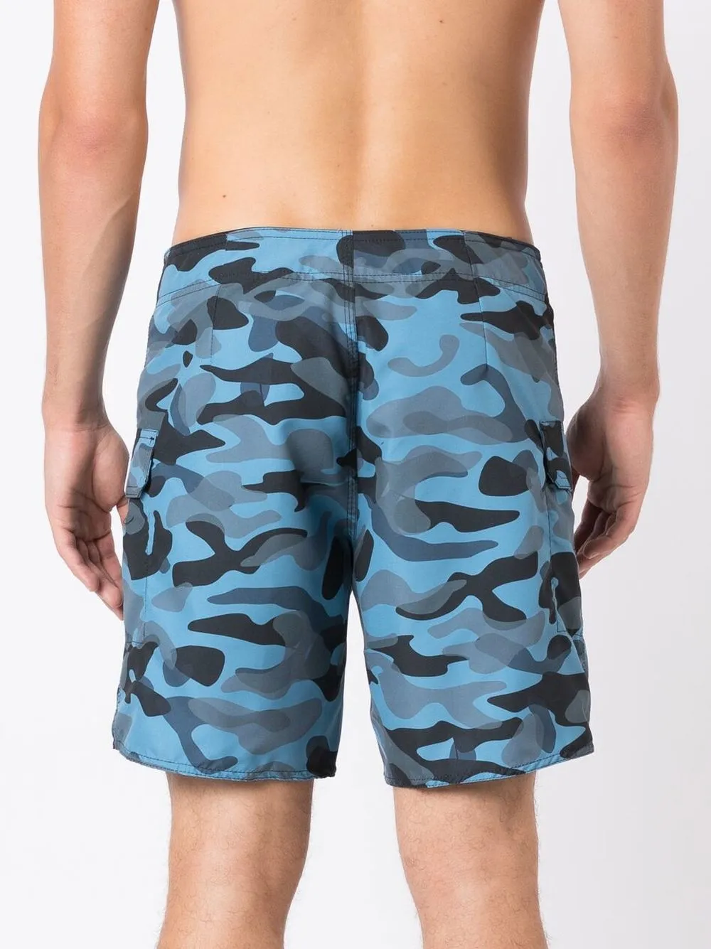 Blau, Stretch-Design, Camouflagemuster, Logo-Patch an der Seite, Kordelzugbund, knielang, zwei Cargotaschen an der Seite.