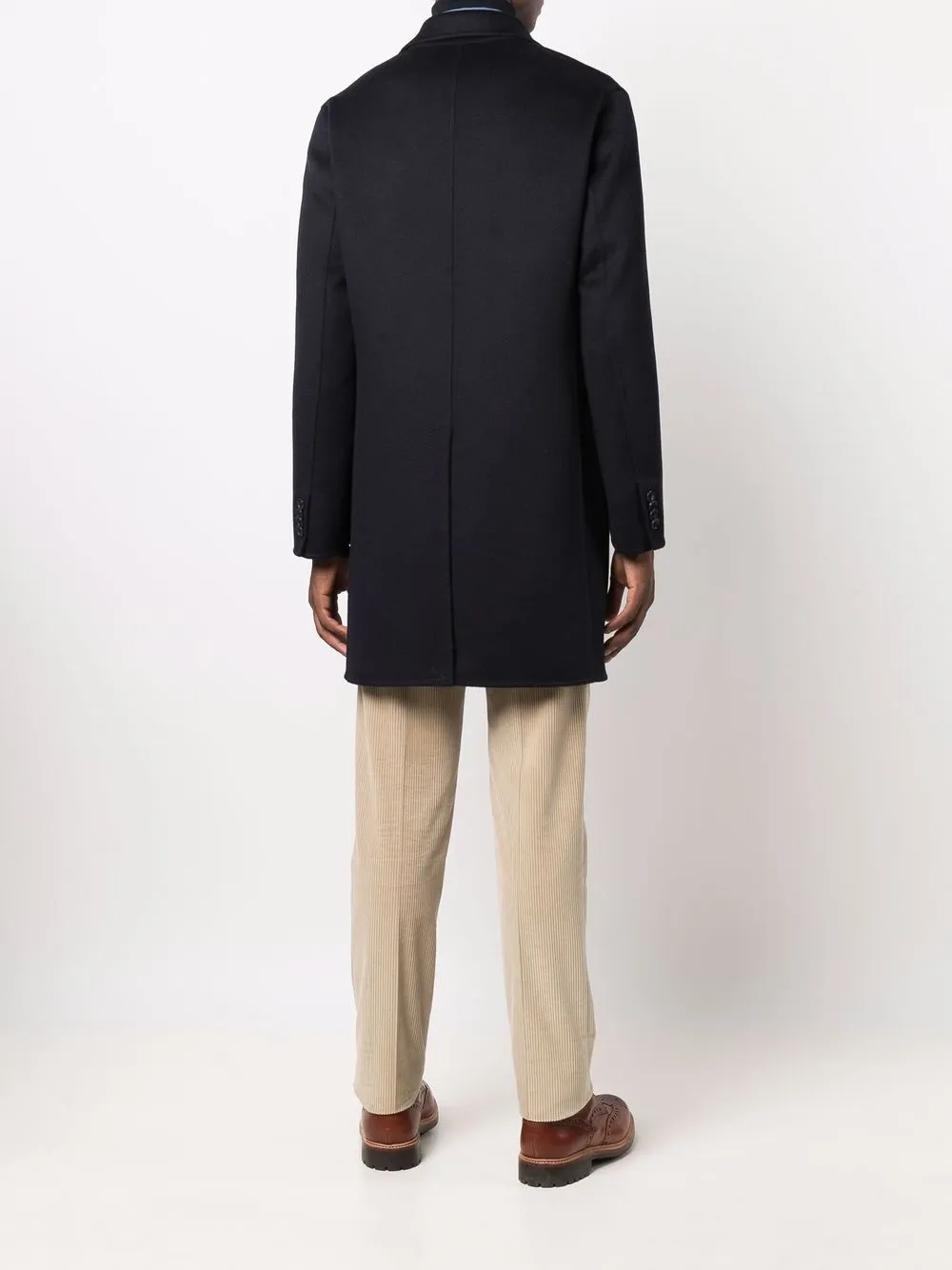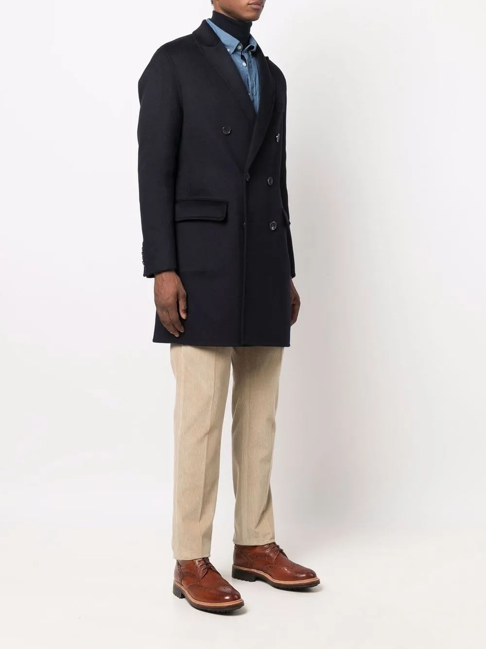 Fallendes Revers, Brusttasche, zwei Pattentaschen vorne, doppelreihiger Knopfverschluss, lange Ärmel, gerader Saum.