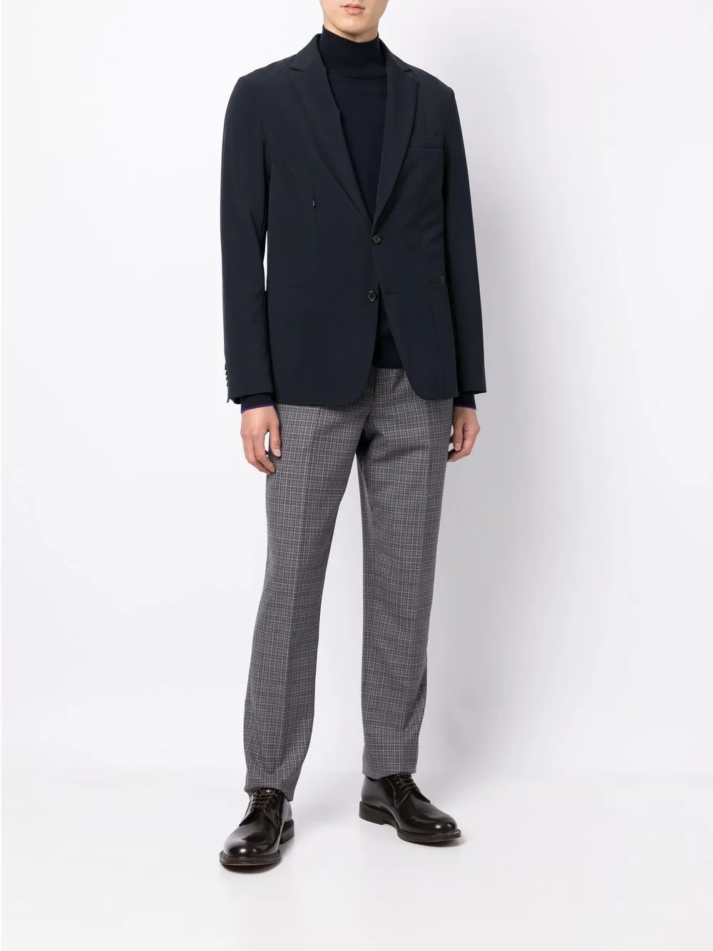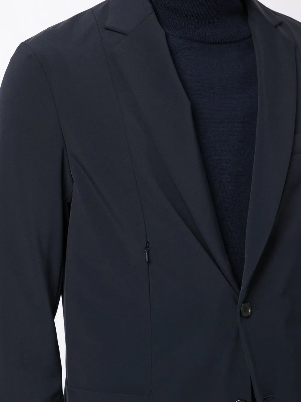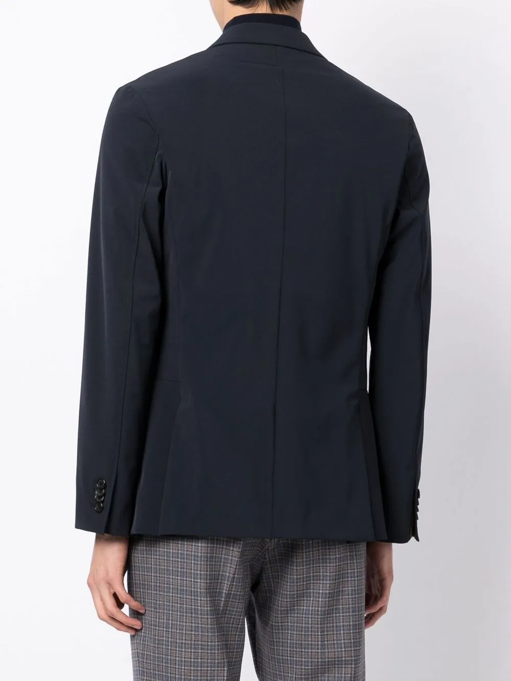 Dunkelblau, Logo-Patch vorne, fallendes Revers, Knopfverschluss vorne, lange Ärmel, Brusttasche, zwei Eingrifftaschen vorne, gerader Saum.