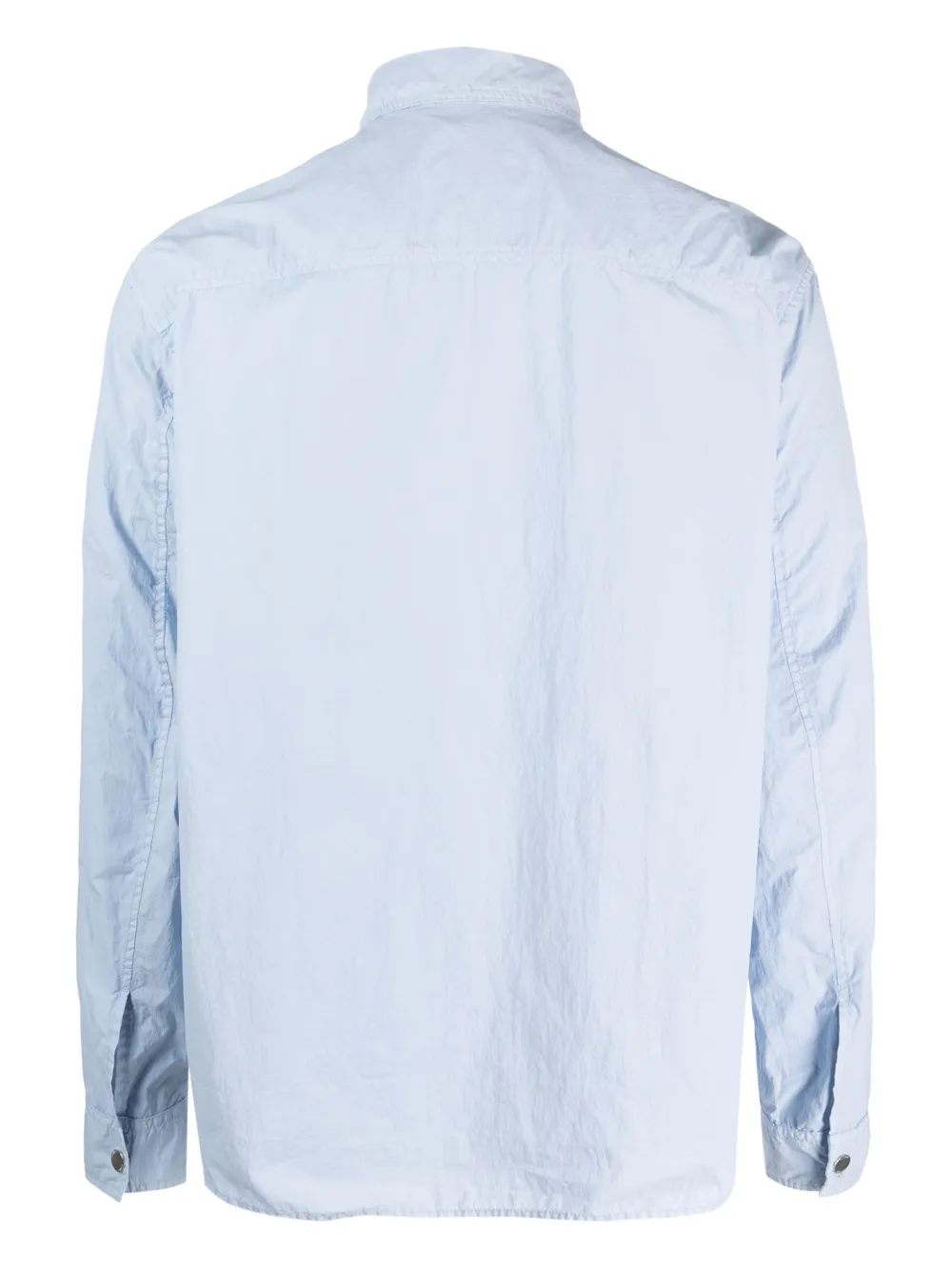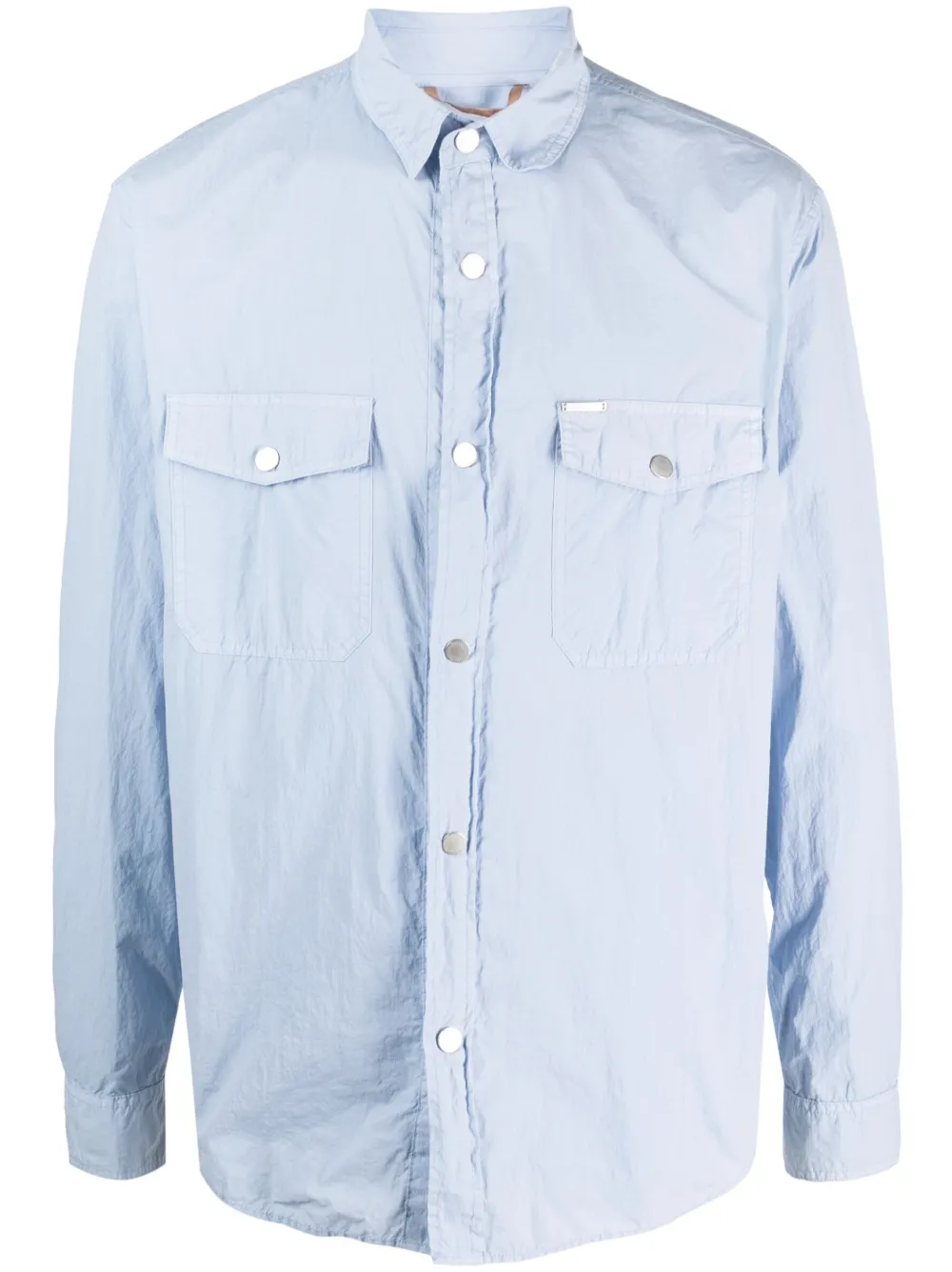 Hellblau, klassischer Kragen, Knopfverschluss vorne, Knopfmanschetten, lange Ärmel, zwei Pattentaschen an der Brust, abgerundeter Saum.