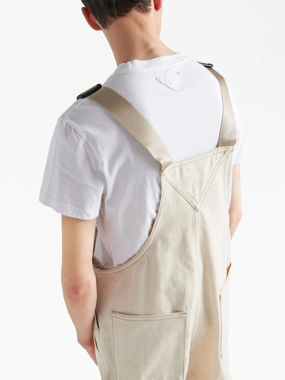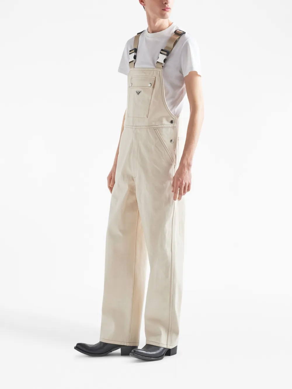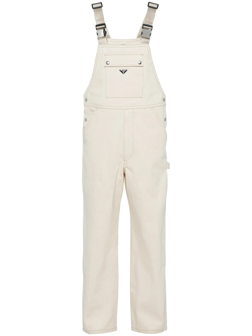 Hellbeige, Baumwolle, Denim, Triangel-Logo aus Emaille, Kontrastnähte, gerades Bein, Schnallenverschluss vorne, Knopfverschluss an der Seite, Pattentasche an der Brust, zwei seitliche Eingrifftaschen, zwei aufgesetzte Taschen vorne.