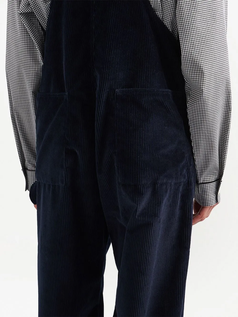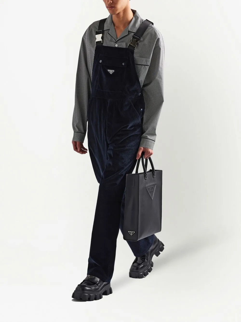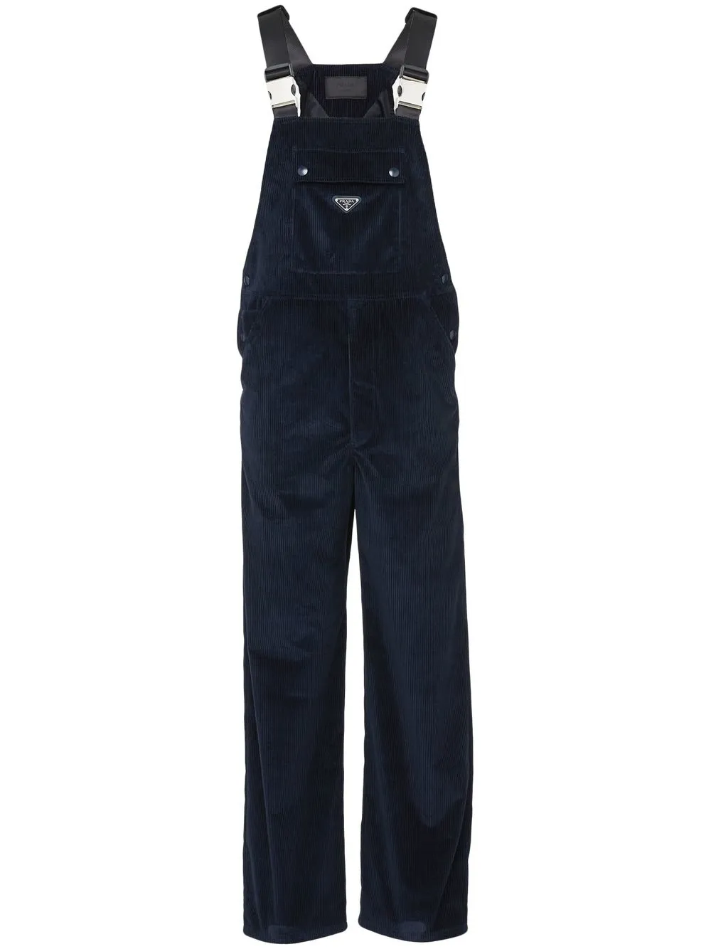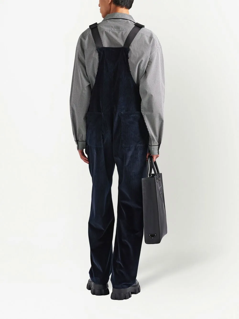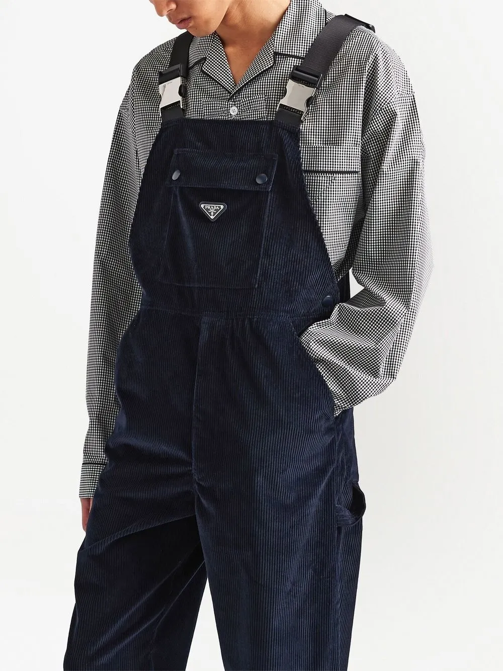Schwarz, Baumwolle, Cord, Triangel-Logo aus Emaille, gerades Bein, Brusttasche mit Knopfverschluss, zwei seitliche Eingrifftaschen, verstellbare Träger.