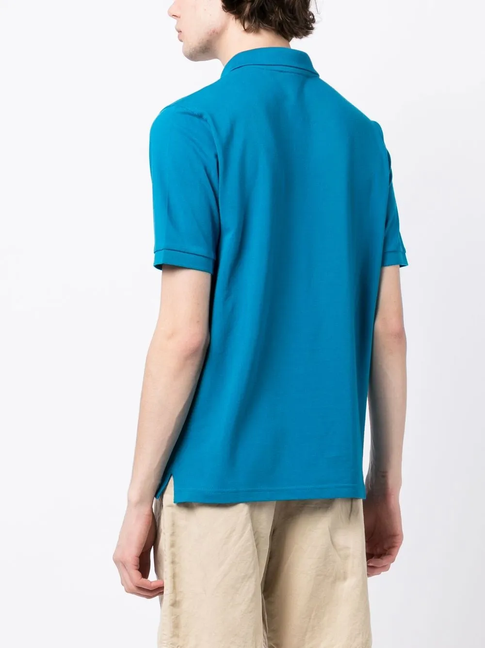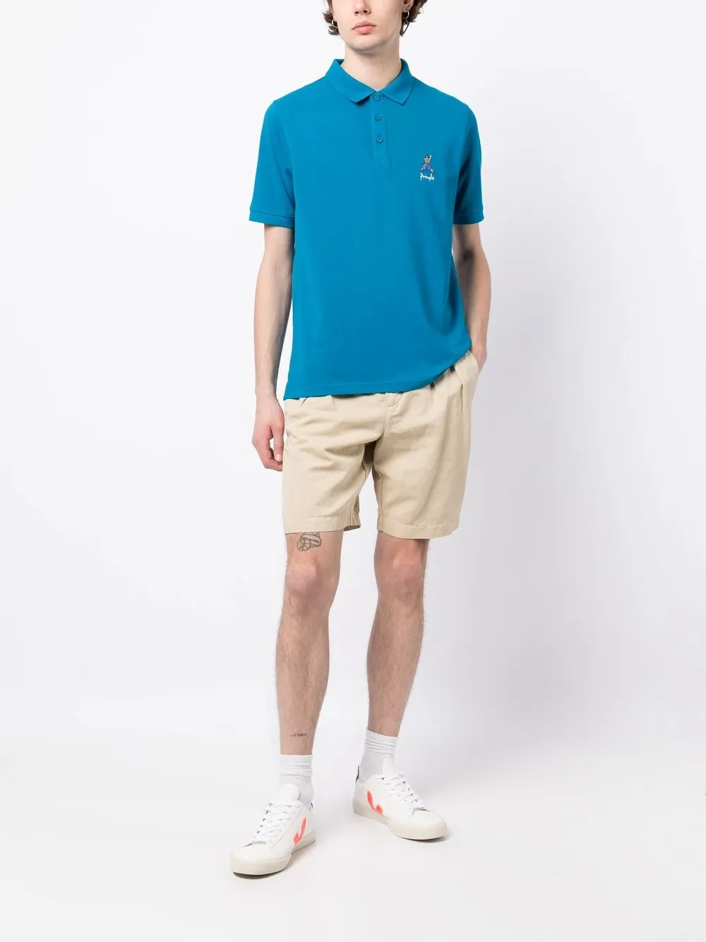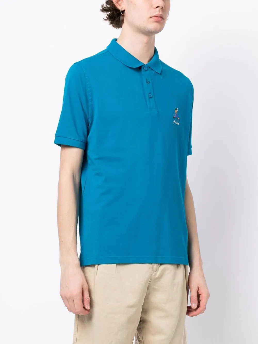 Blau, Baumwolle, aufgesticktes Motiv, Poloshirtkragen, kurze Ärmel, gerader Saum. Dieser Unisex-Artikel wird in Herrengrößen angezeigt.