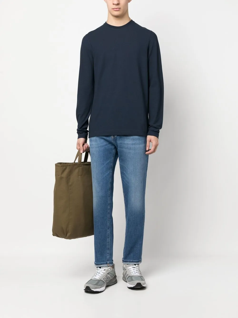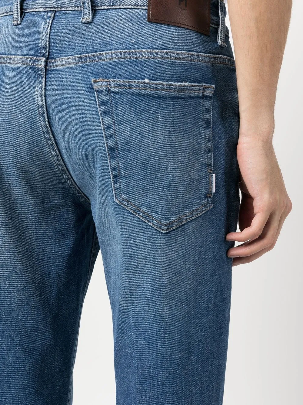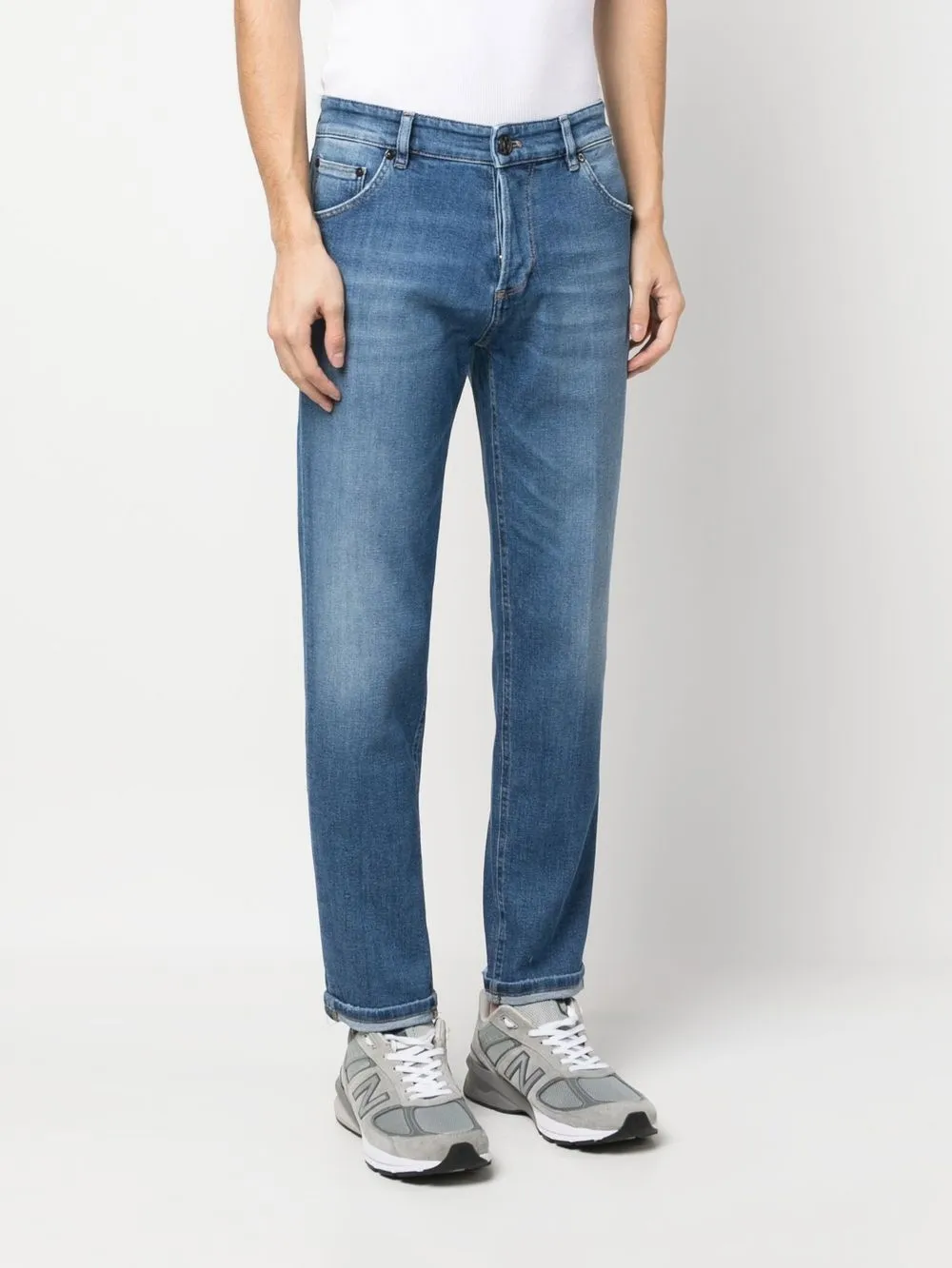 Ozeanblau, gewaschener Denim, Tragefalten, gerades Bein, Knopf- und Reißverschluss vorne, Five-Pocket-Design.