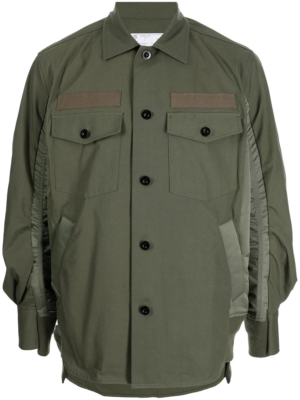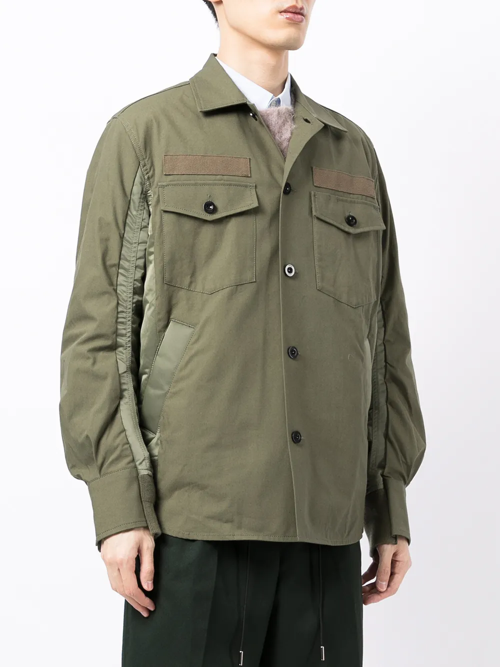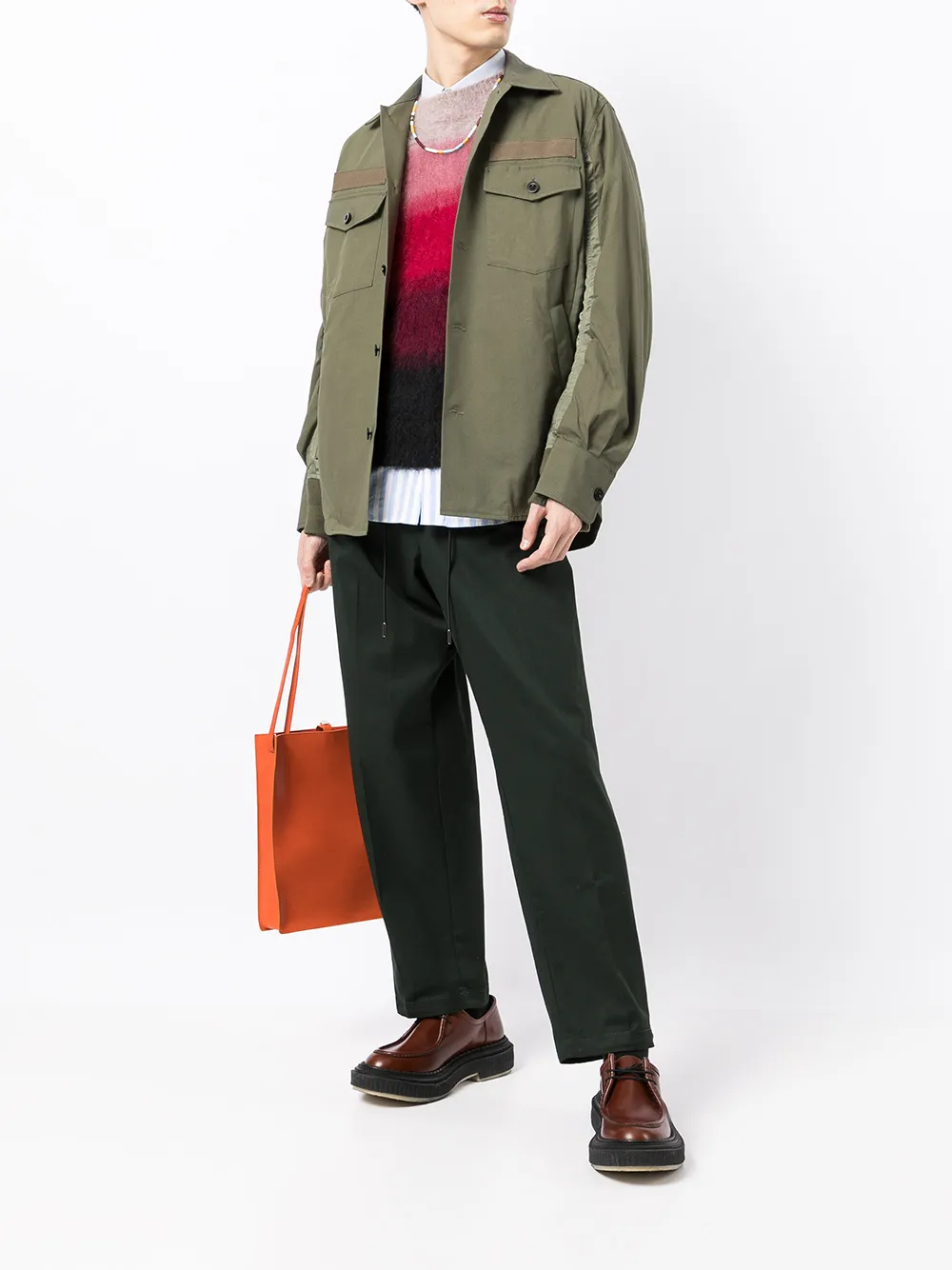 Satinbesatz, klassischer Kragen, Knopfverschluss vorne, lange Ärmel, zwei Pattentaschen an der Brust, zwei Eingrifftaschen vorne, gerader Saum. Material: Baumwolle.
