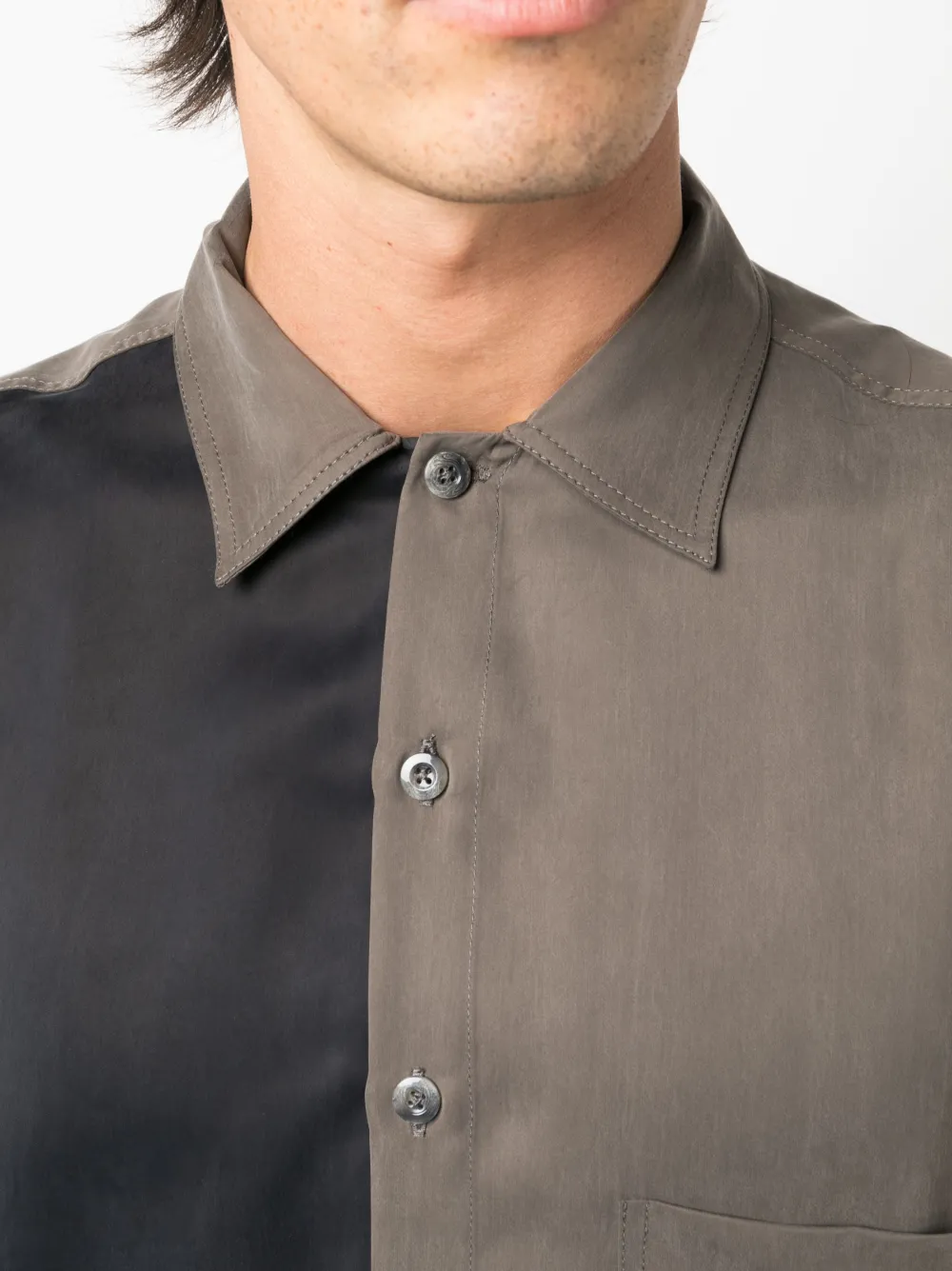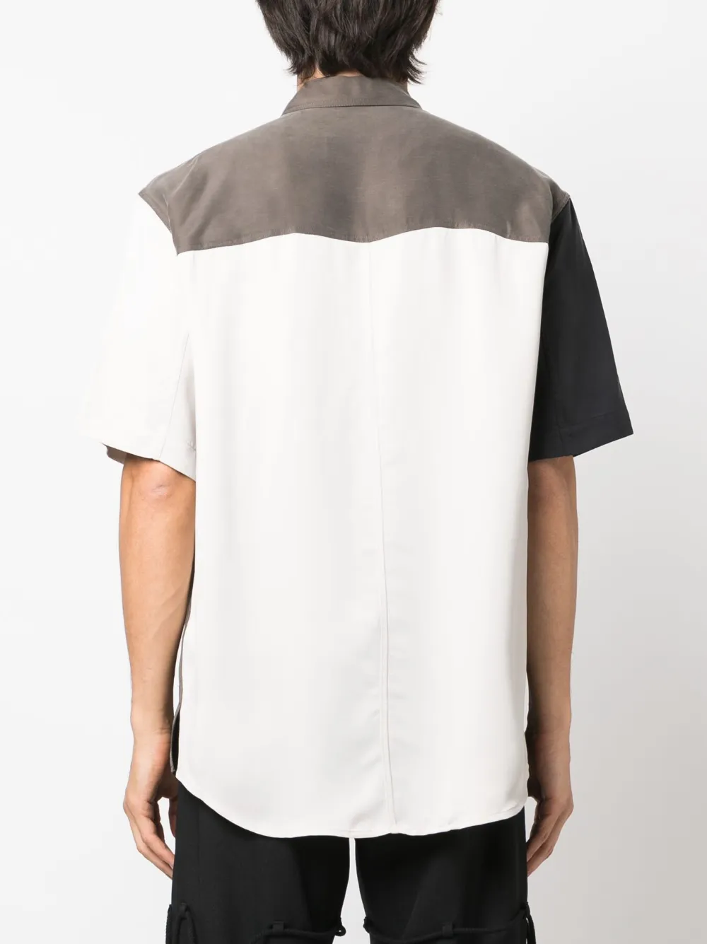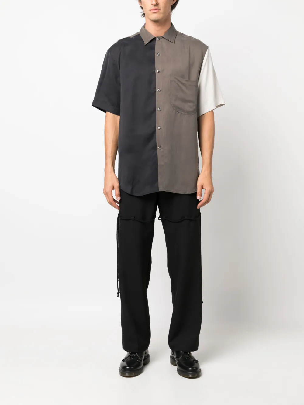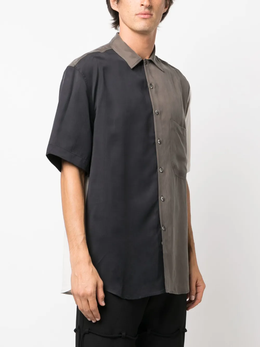 Schwarz, Braun, Wollweiß, Colour-Block-Optik, klassischer Kragen, Knopfverschluss vorne, kurze Ärmel, aufgesetzte Brusttasche, gerader Saum.