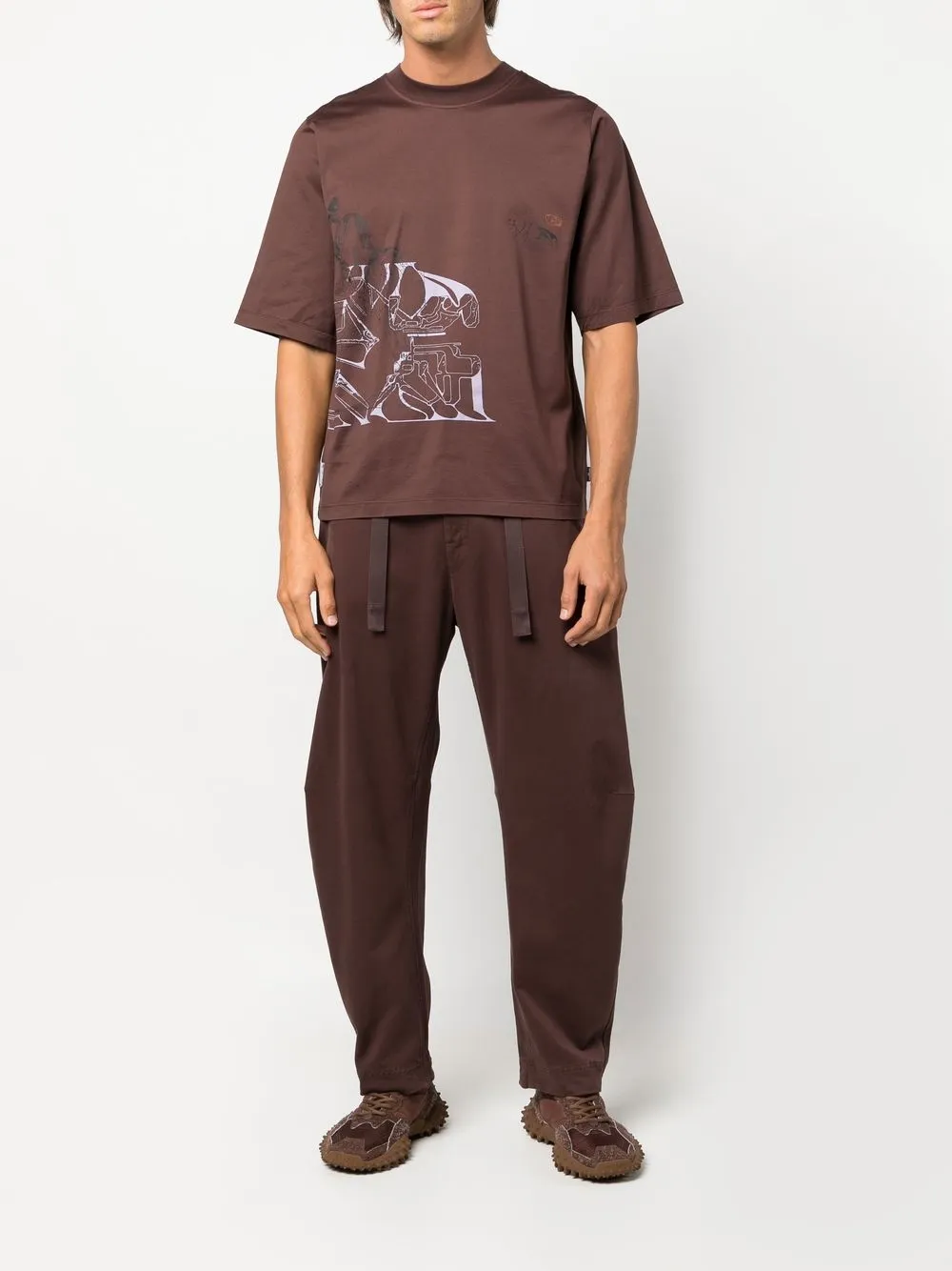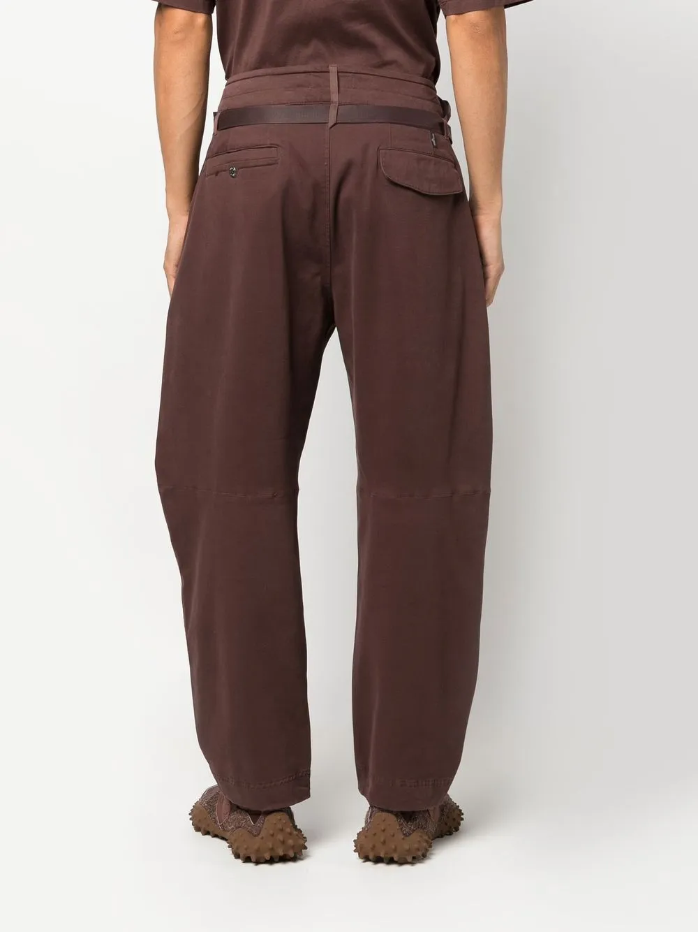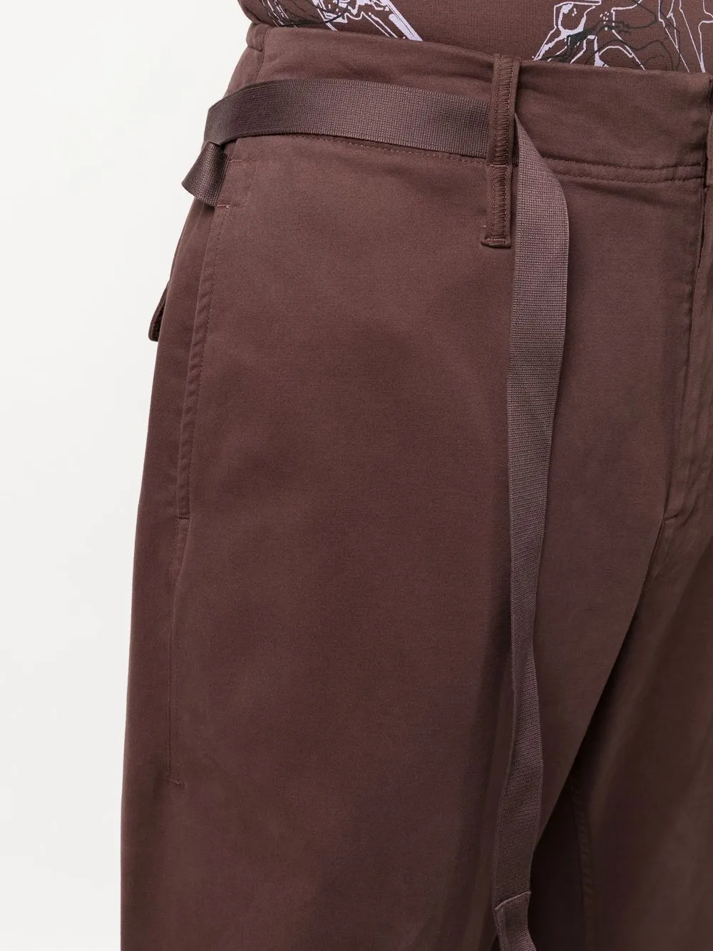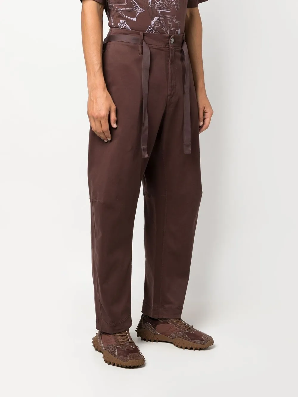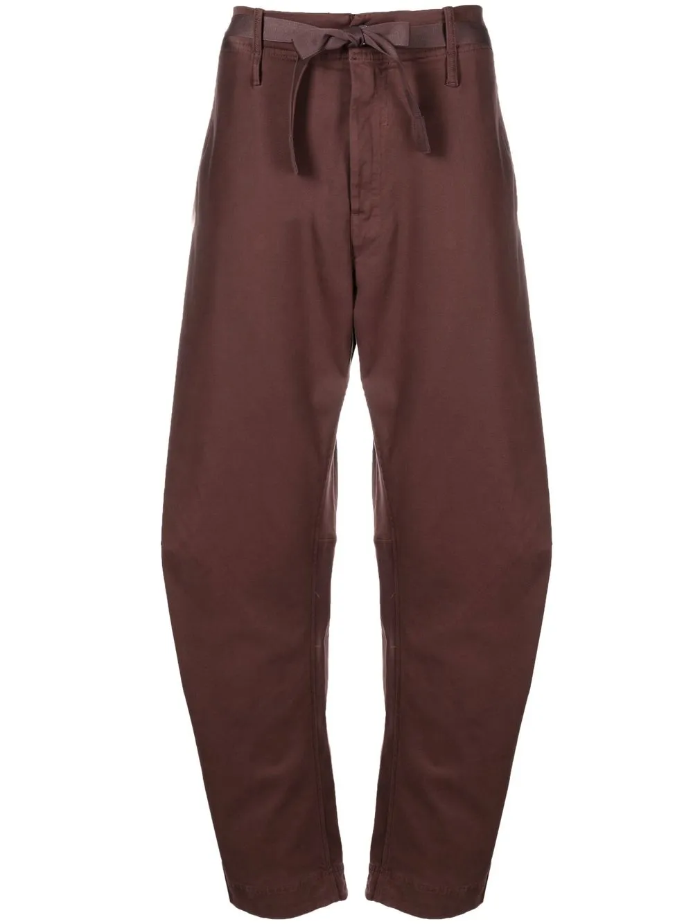 Braun, Baumwollgemisch, taillenhoher Schnitt, Bindegürtel, Knopfverschluss vorne, Gürtelschlaufen, Tapered-Bein.