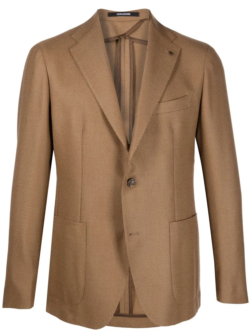 Karamellbraun, Schurwolle, fallendes Revers, Knopfverschluss vorne, lange Ärmel, Knopfmanschetten, Brusttasche, zwei Beuteltaschen vorne.