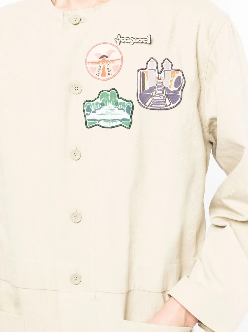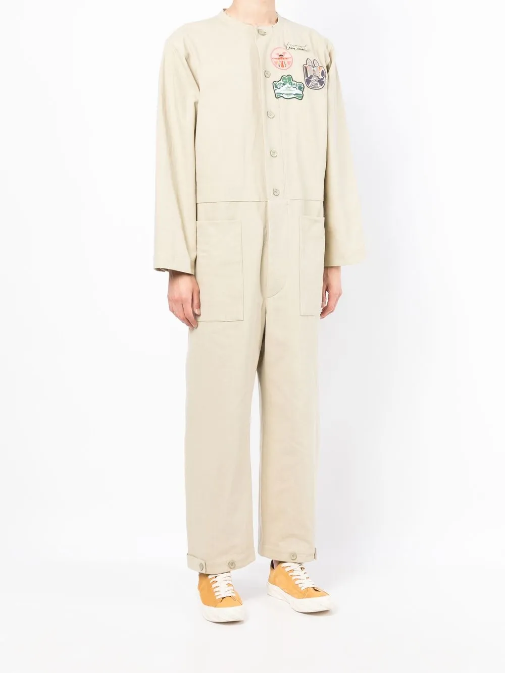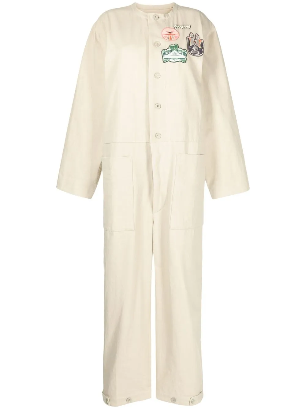 Baumwolle, Applikationen, Knopfverschluss vorne, runder Ausschnitt, lange Ärmel, Knopfmanschetten, elastischer Bund, zwei aufgesetzte Taschen vorne, eingefasste Gesäßtasche, gerades Bein.