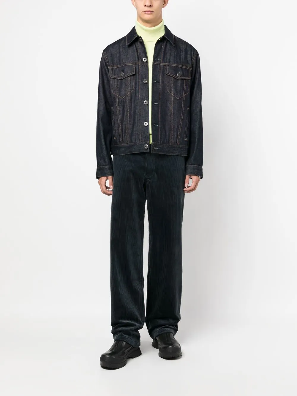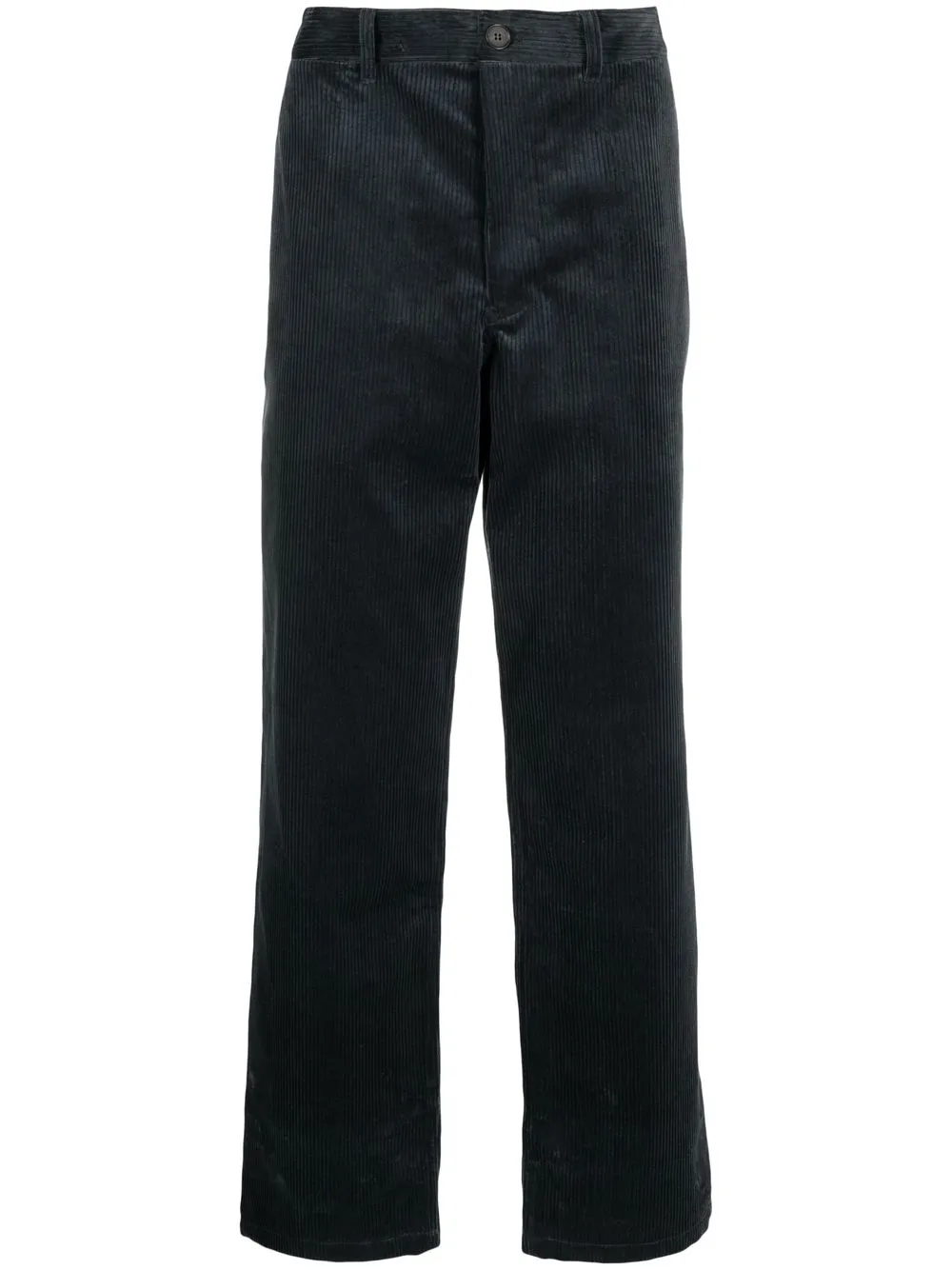 Knopf- und Reißverschluss vorne, zwei Eingrifftaschen an der Seite, zwei eingefasste Gesäßtaschen.