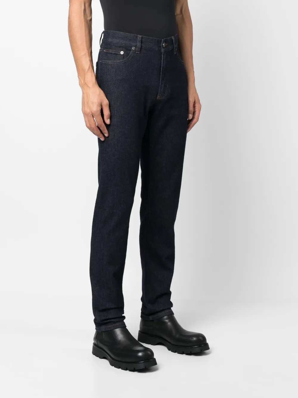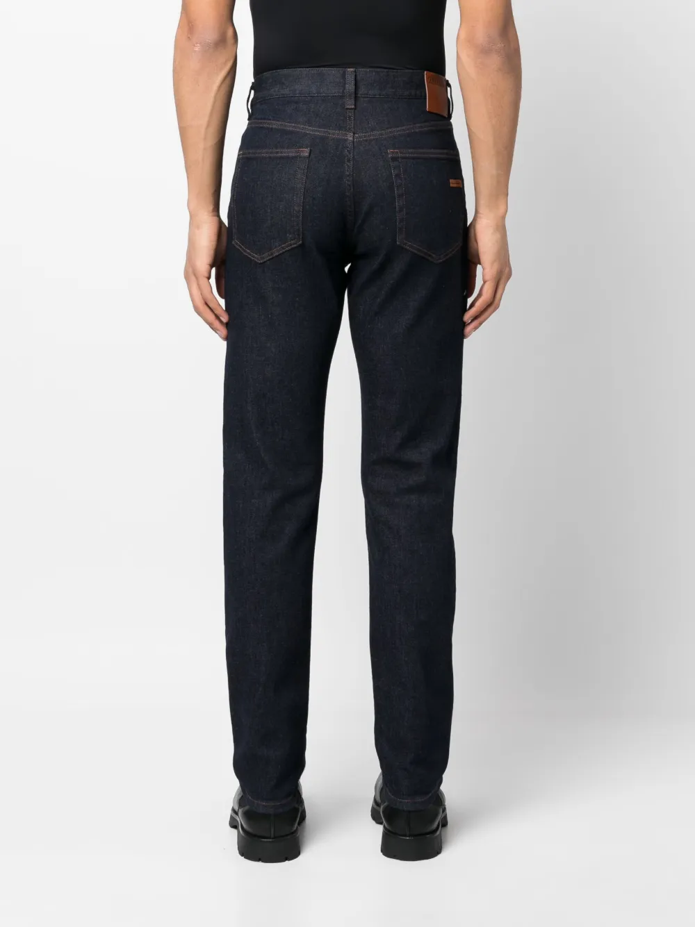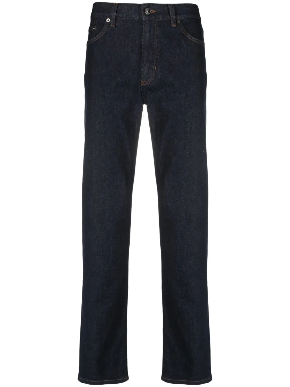 Blau, Baumwollgemisch, Logo-Patch hinten, Gürtelschlaufen, mittlere Taille, gerades Bein, Knopfverschluss vorne, Five-Pocket-Design.