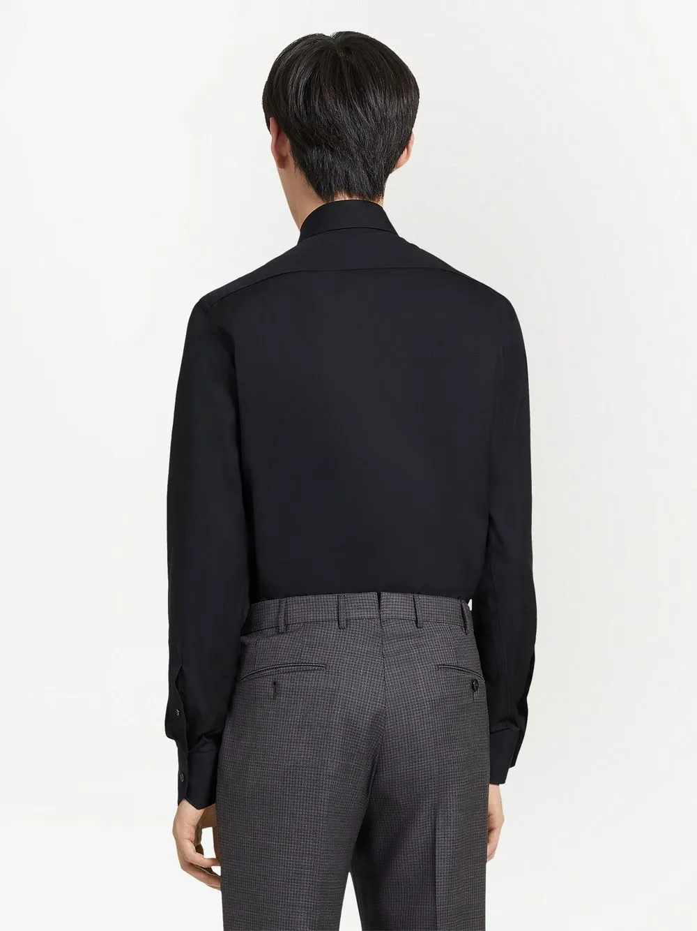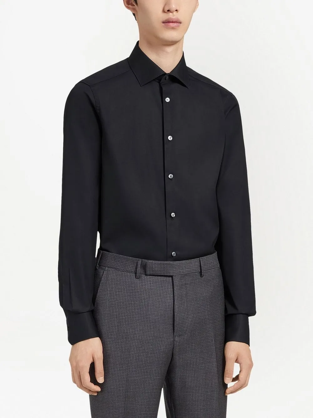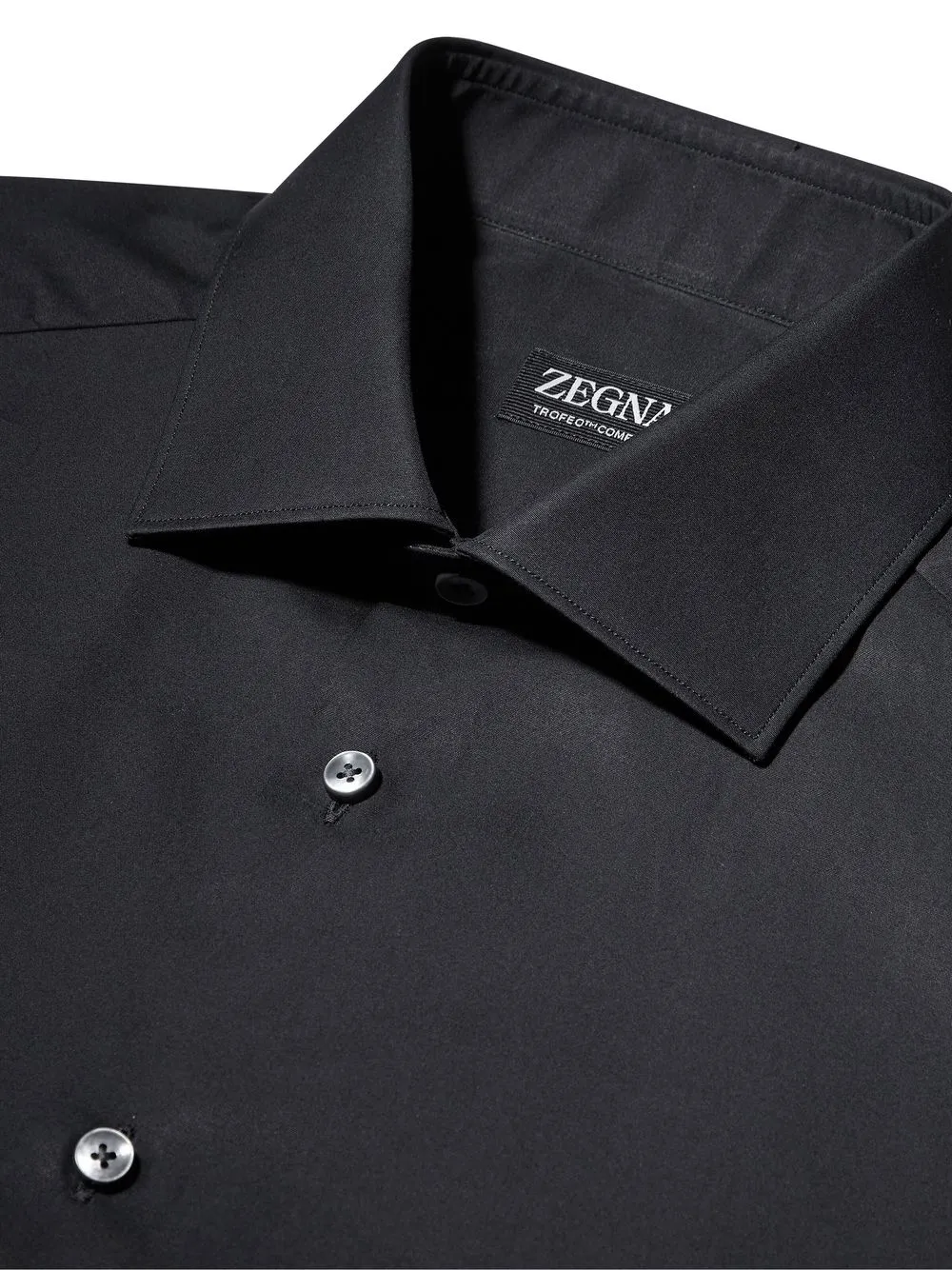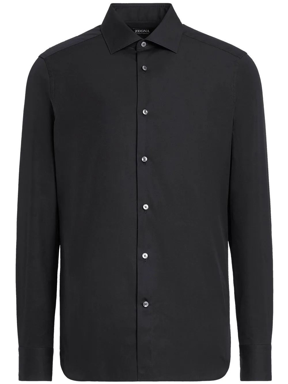 Schwarz, Trofeo-Baumwolle, klassischer Schnitt, Knopfverschluss vorne, Spreizkragen, Knopfmanschetten, lange Ärmel, abgerundeter Saum.