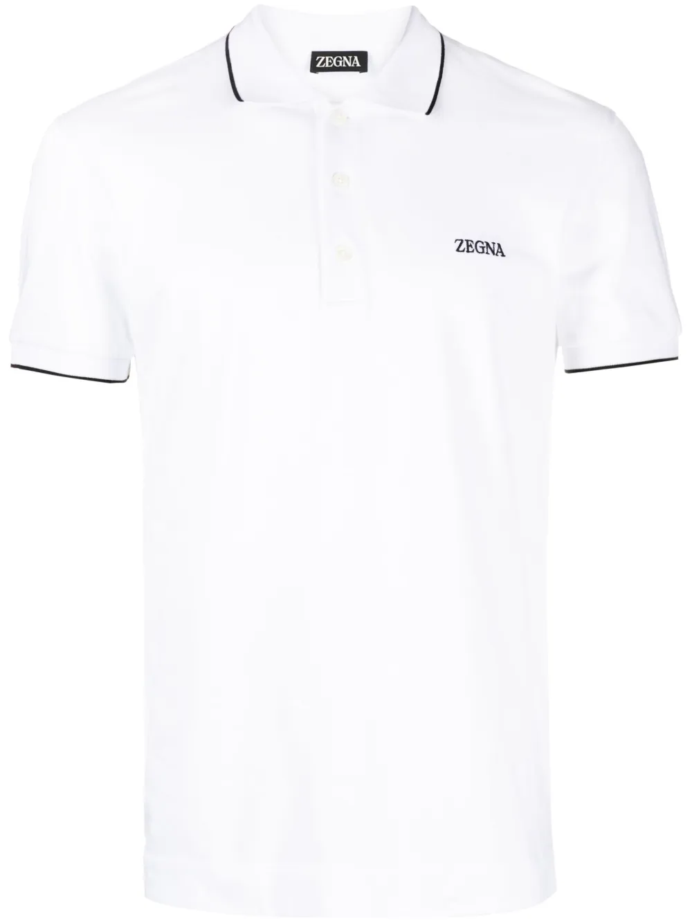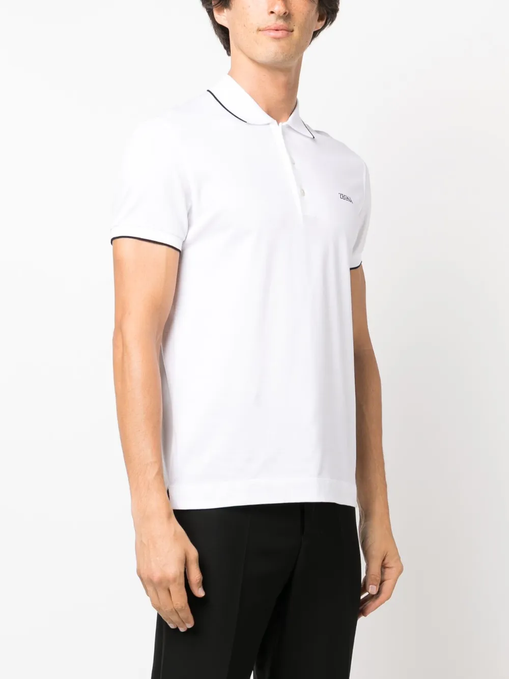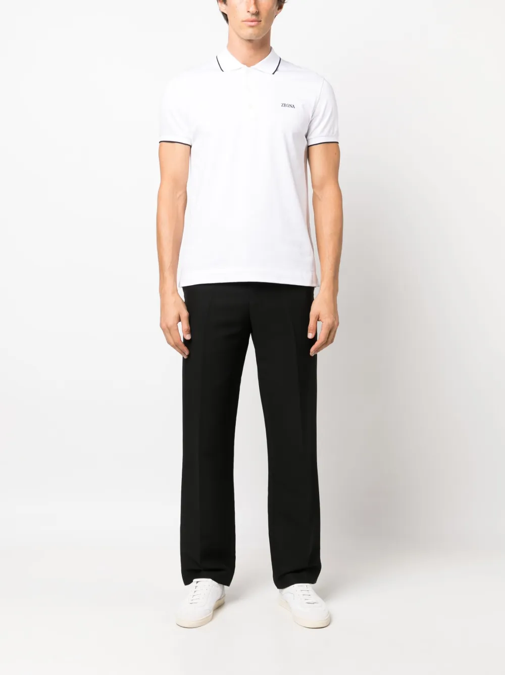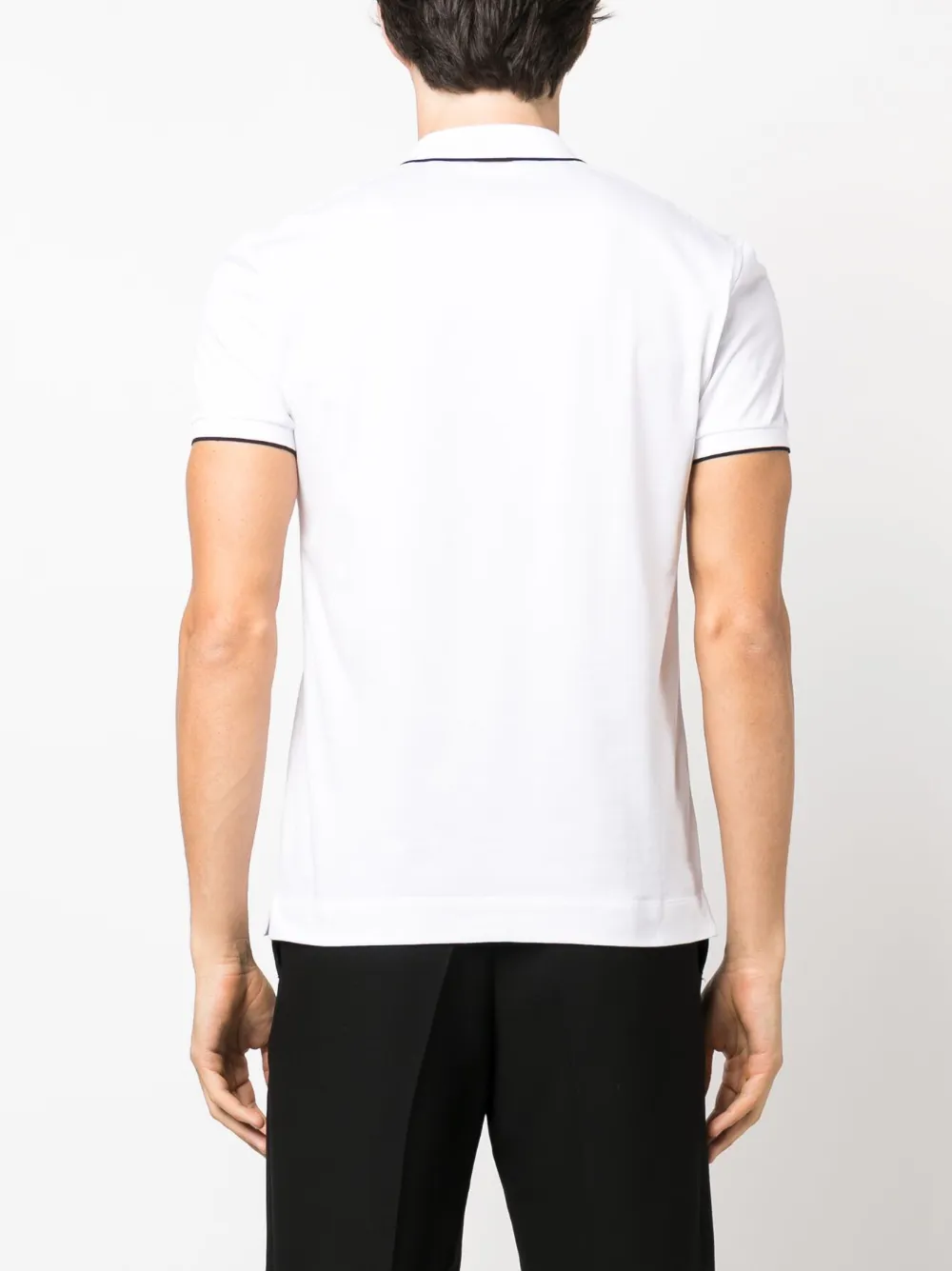 Optisches Weiß, Kontrastbesatz, Logo-Stickerei an der Brust, Poloshirtkragen, kurze Knopfleiste vorne, kurze Ärmel, gerader Saum.