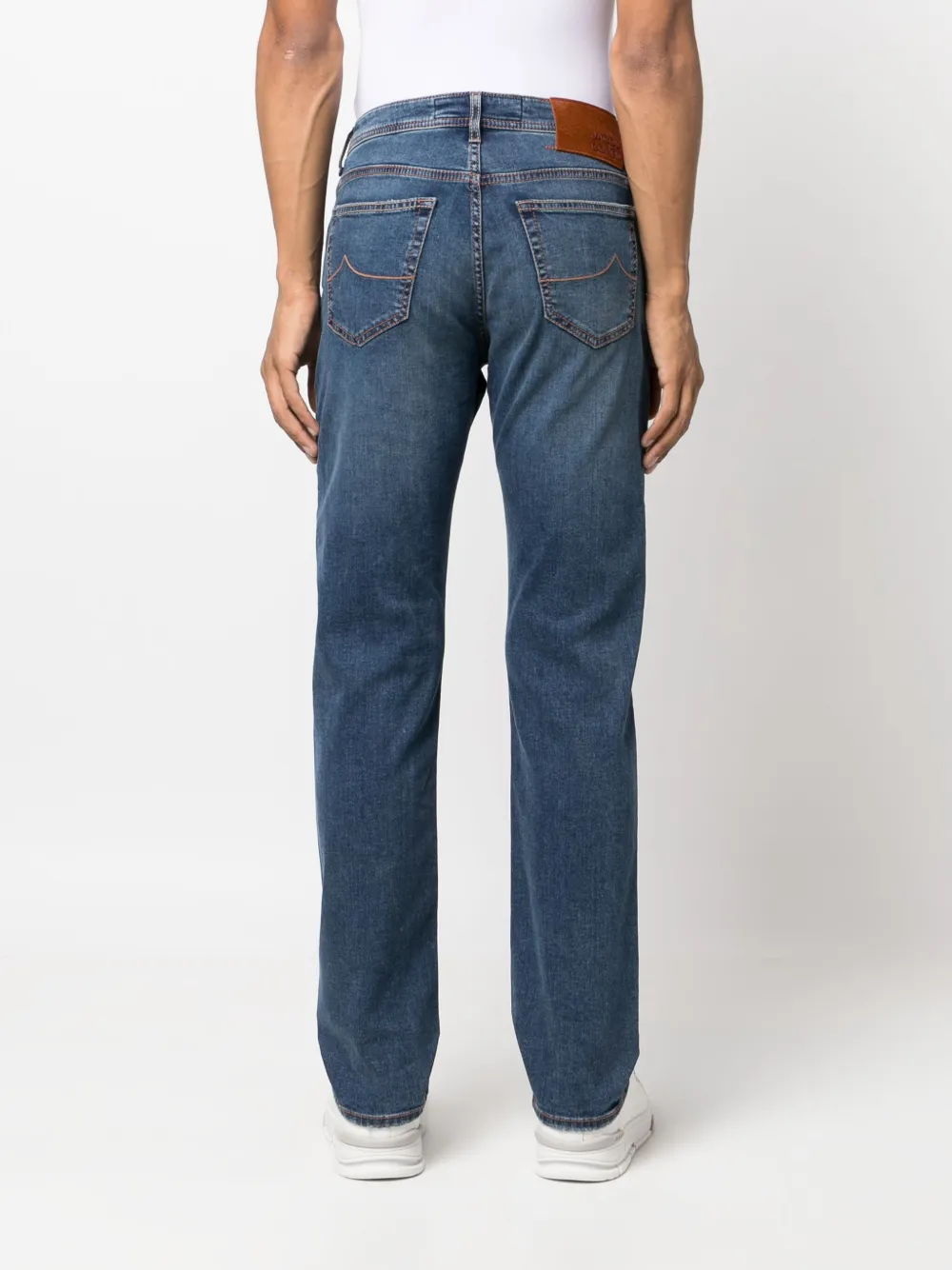 logo-patch cotton jeans from Jacob Cohën featuring navy blue, stretch-cotton, logo patch to the rear, belt loops, front button and zip fastening, classic five pockets and tapered leg.